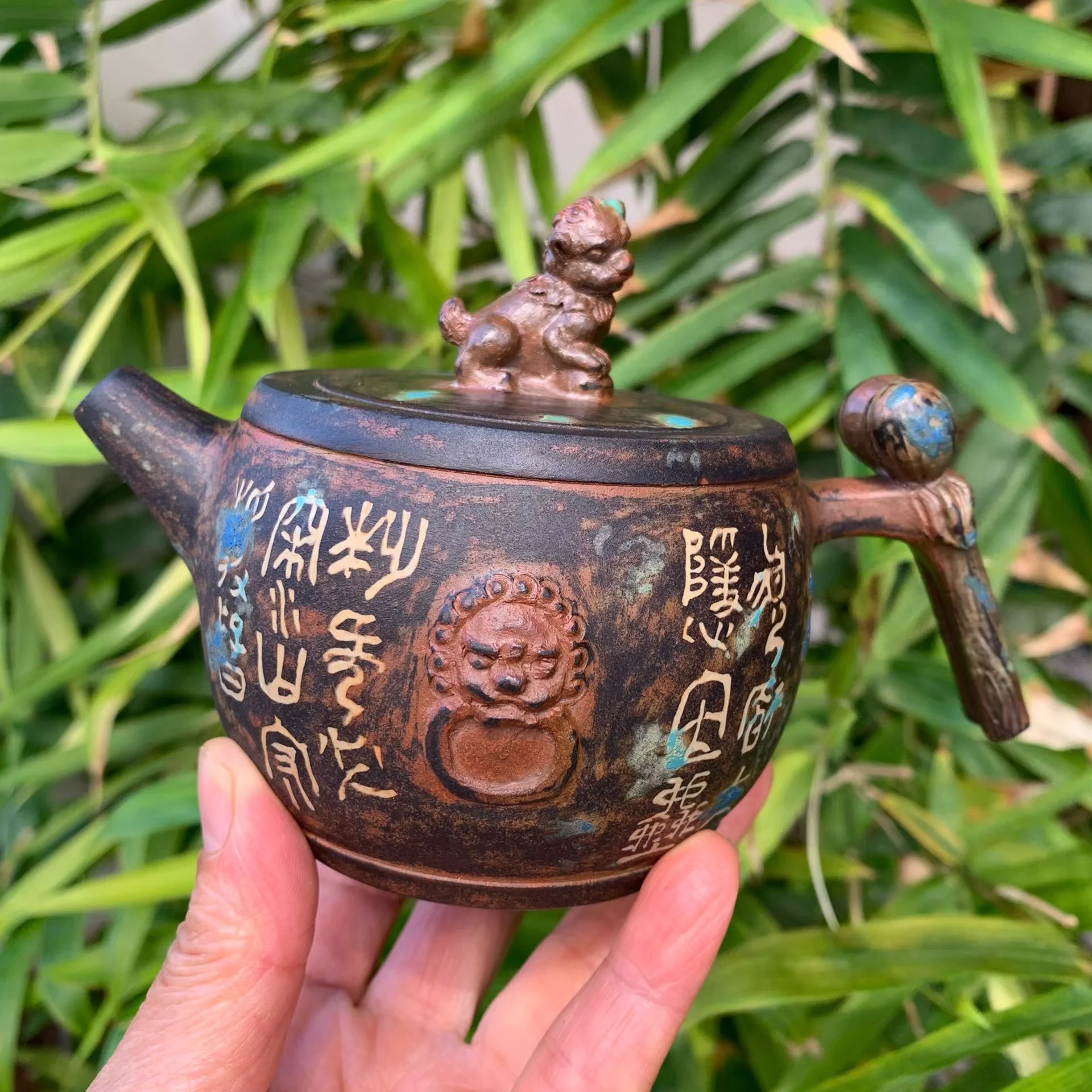 Чайник виконаний у стилі 金文装饰 (Jinwen Zhuangshi), заснованому на образах давніх бронзових ієрогліфів епох Шан і Чжоу.
