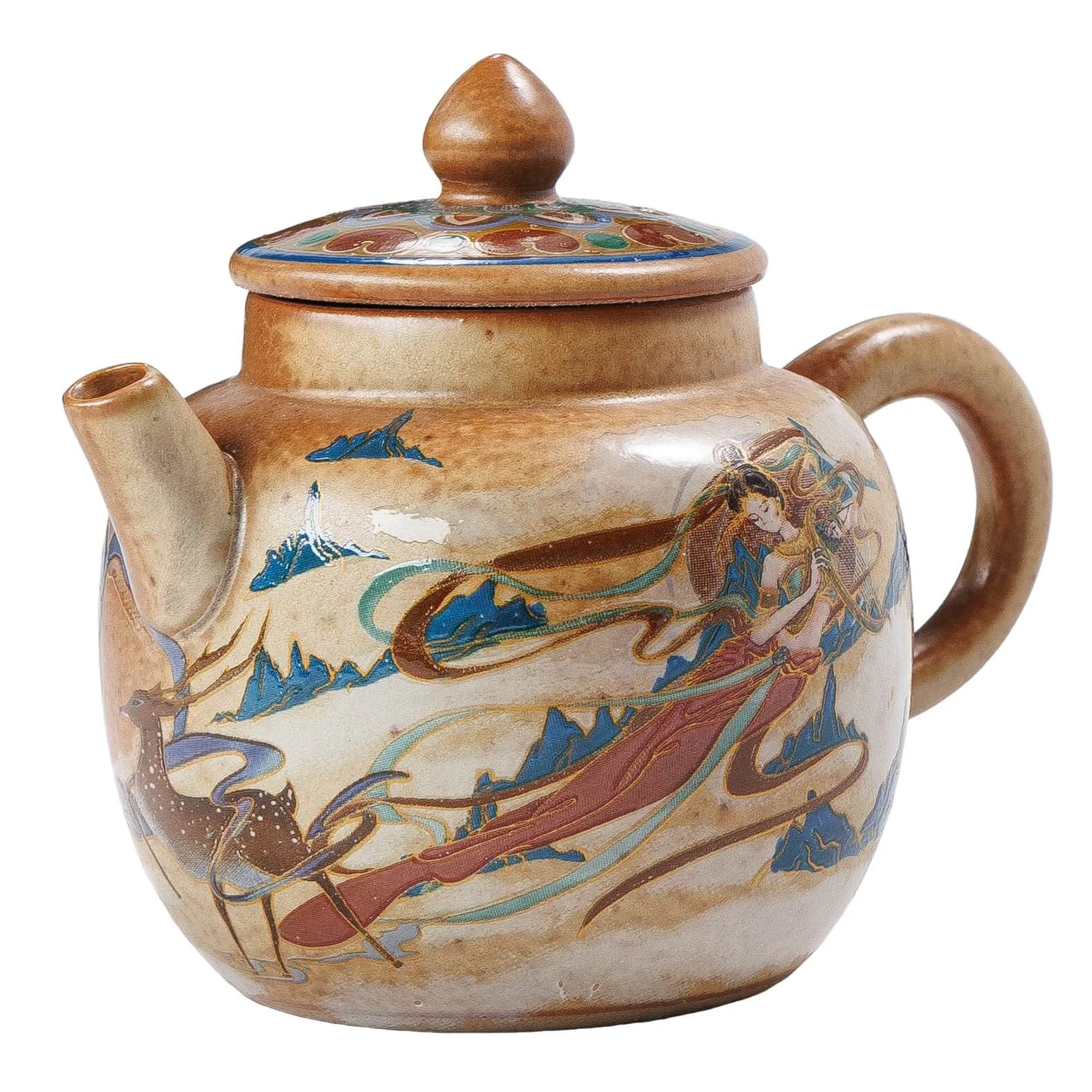 Чайник «Апсарас» — витончений глиняний посуд із зображенням небесної музи у стилі дуньхуанських фресок. Компактний об’єм (160 мл), класична форма й теплий розпис створюють ідеальний варіант для щоденного чаювання з відтінком стародавньої краси.