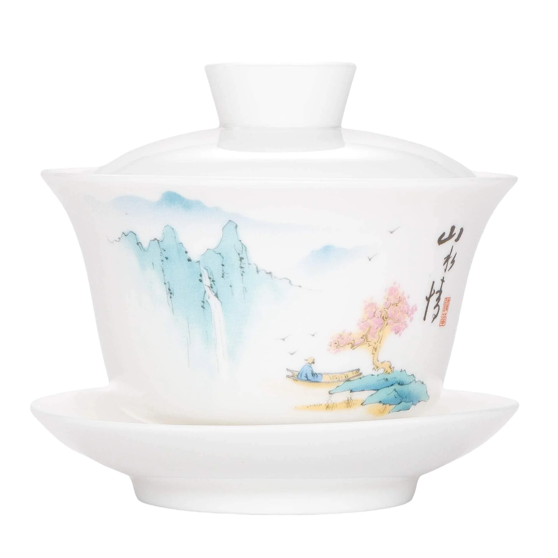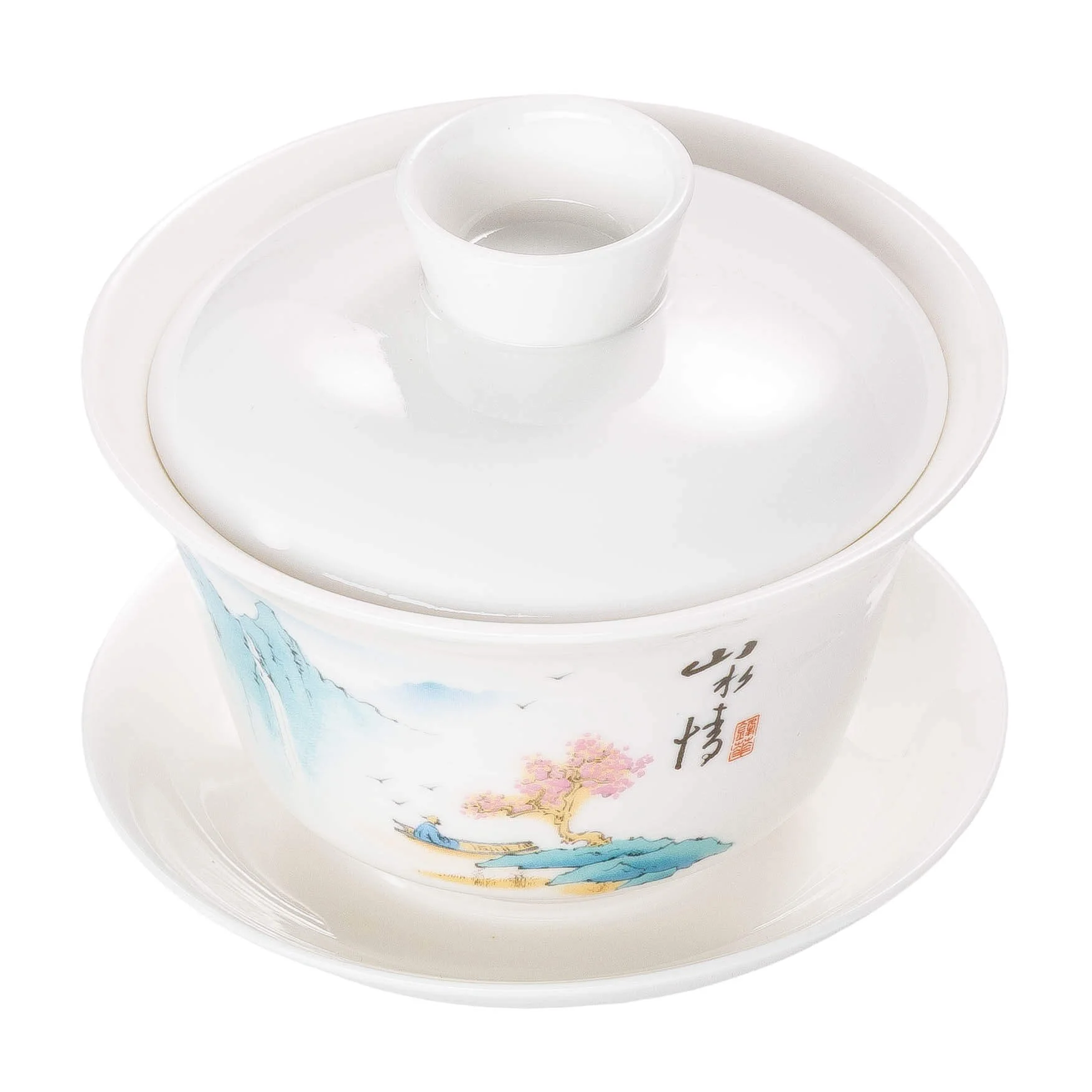 Витончена порцелянова гайвань, малюнок виконаний у стилі традиційного китайського живопису та має глибокий символізм. Сакура біля води поруч із мудрецем у човні створює образ ідеального відпочинку. Це символ відсторонення від буденної суєти та пошуку гармонії всередині себе. Цвітіння асоціюється з успіхом у справах та фінансовим благополуччям.