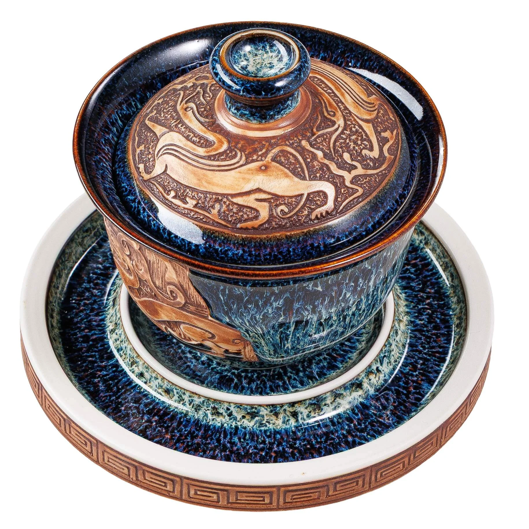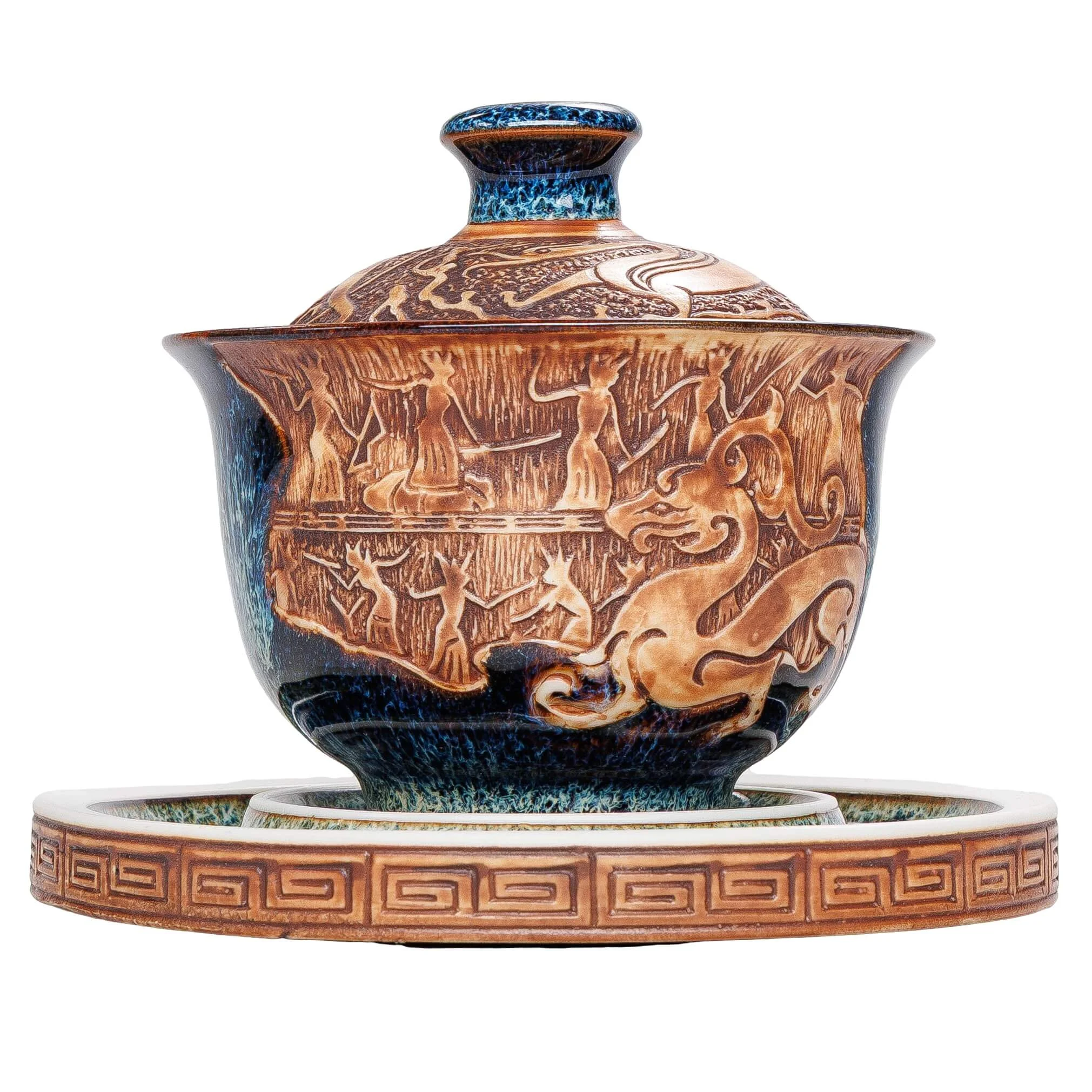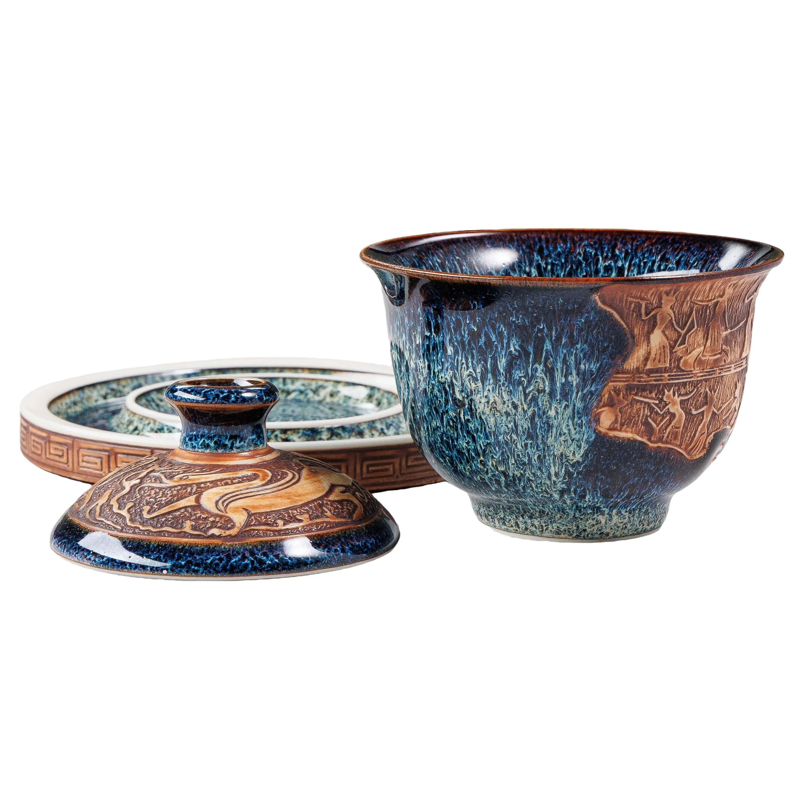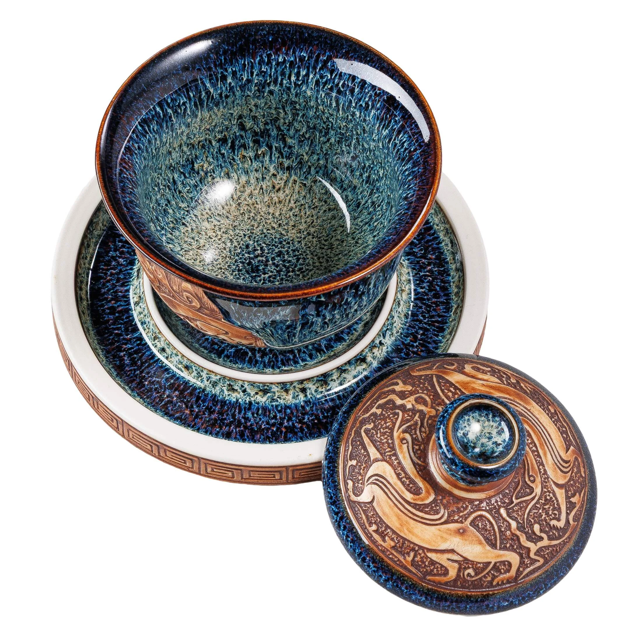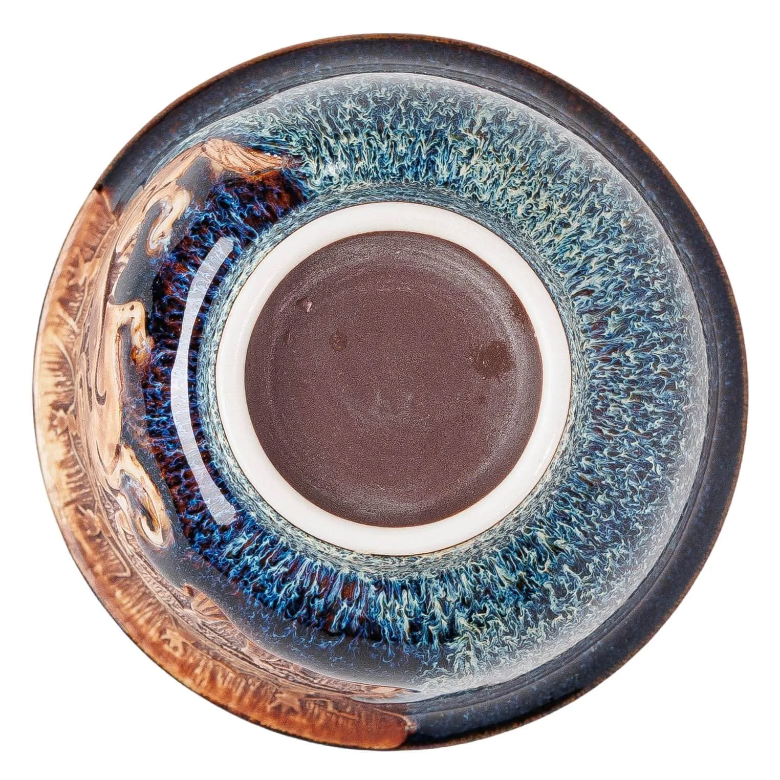 “Вогняна Гармонія” — це гайвань, народжена у полум’ї. Під час випалу глазур проходить через природне перетворення — техніка вогняного переливу (窑变) надає поверхні живої глибини та неповторного кольору. Вогонь малює на глині візерунки, створюючи ефект плинної глазурі з переходами від глибокого цзюньського синього (钧蓝) до мідно-золотистого. Кожна гайвань має свій характер, адже результат цього процесу неможливо повторити — це справжнє мистецтво полум’я.