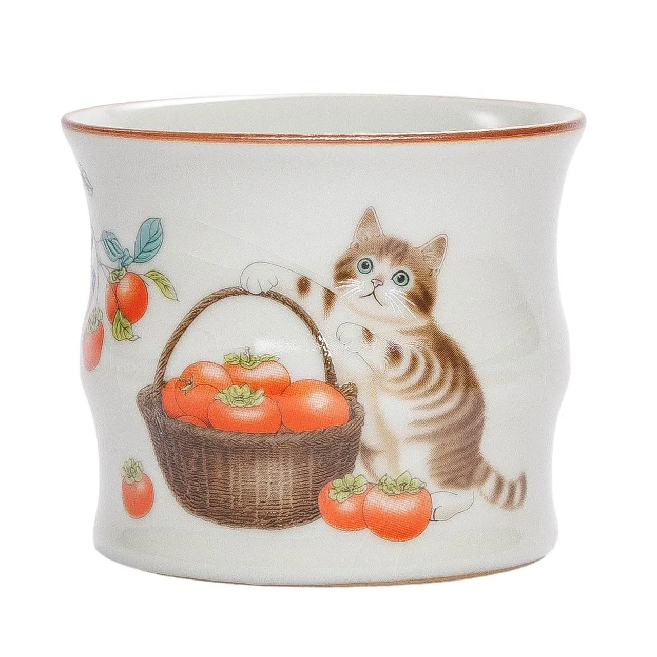 Піала «Кіт і хурма» виготовлена з кераміки Дэхуа та належить до серії з теплим сюжетним декором. Піала має форму, натхненну бамбуком: плавні вертикальні переходи надають виробу виразного силуету та роблять його приємним у використанні.