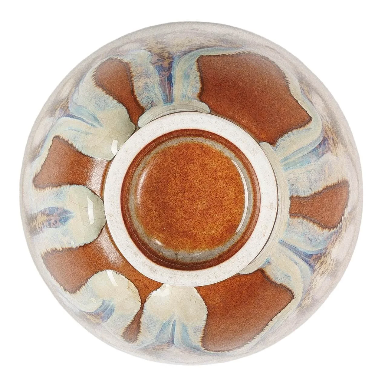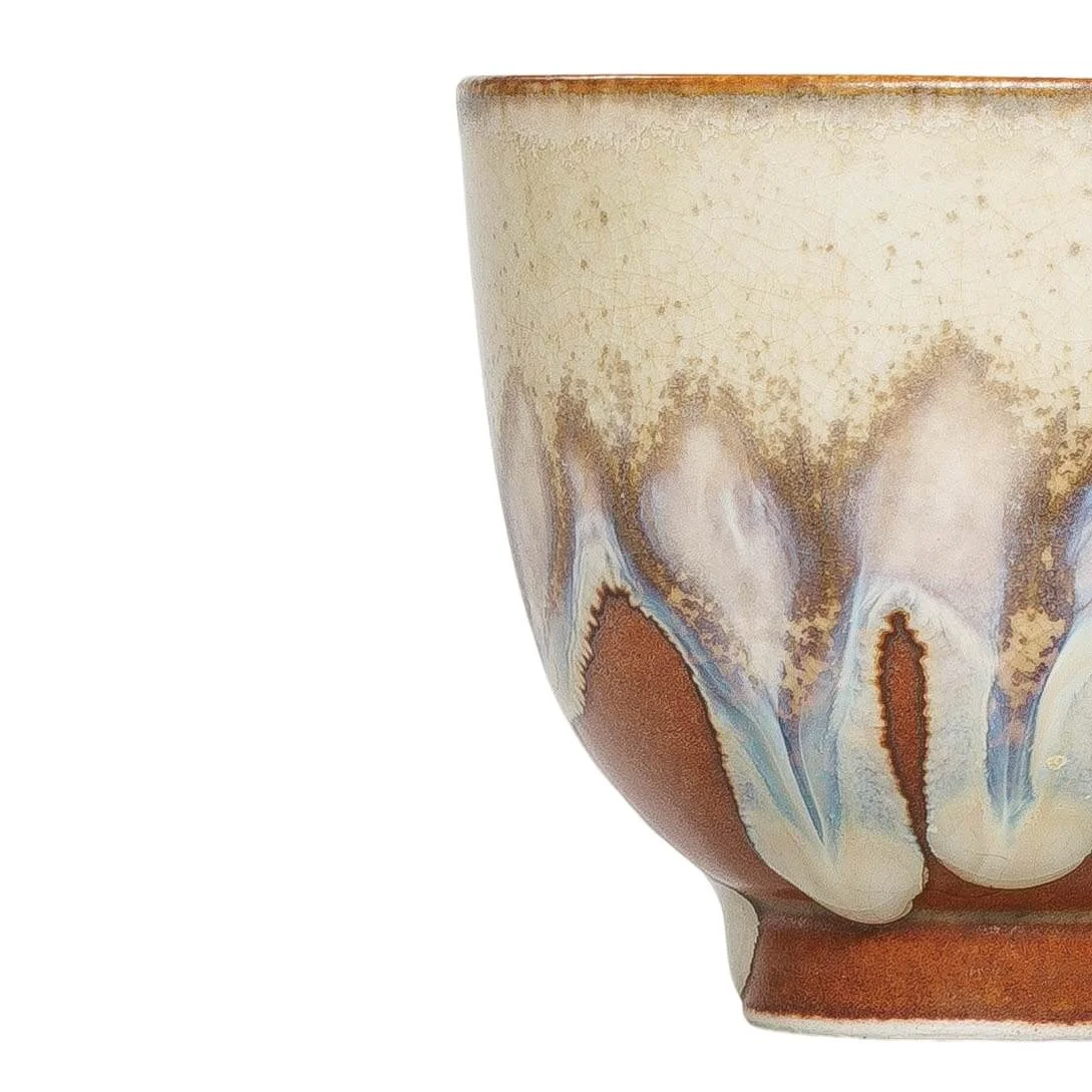 Зовнішня частина покрита багатошаровою глазур'ю, яка під час випалу створює унікальні патьоки та переходи кольорів — від бежевого до глибокого коричневого та синюватого.