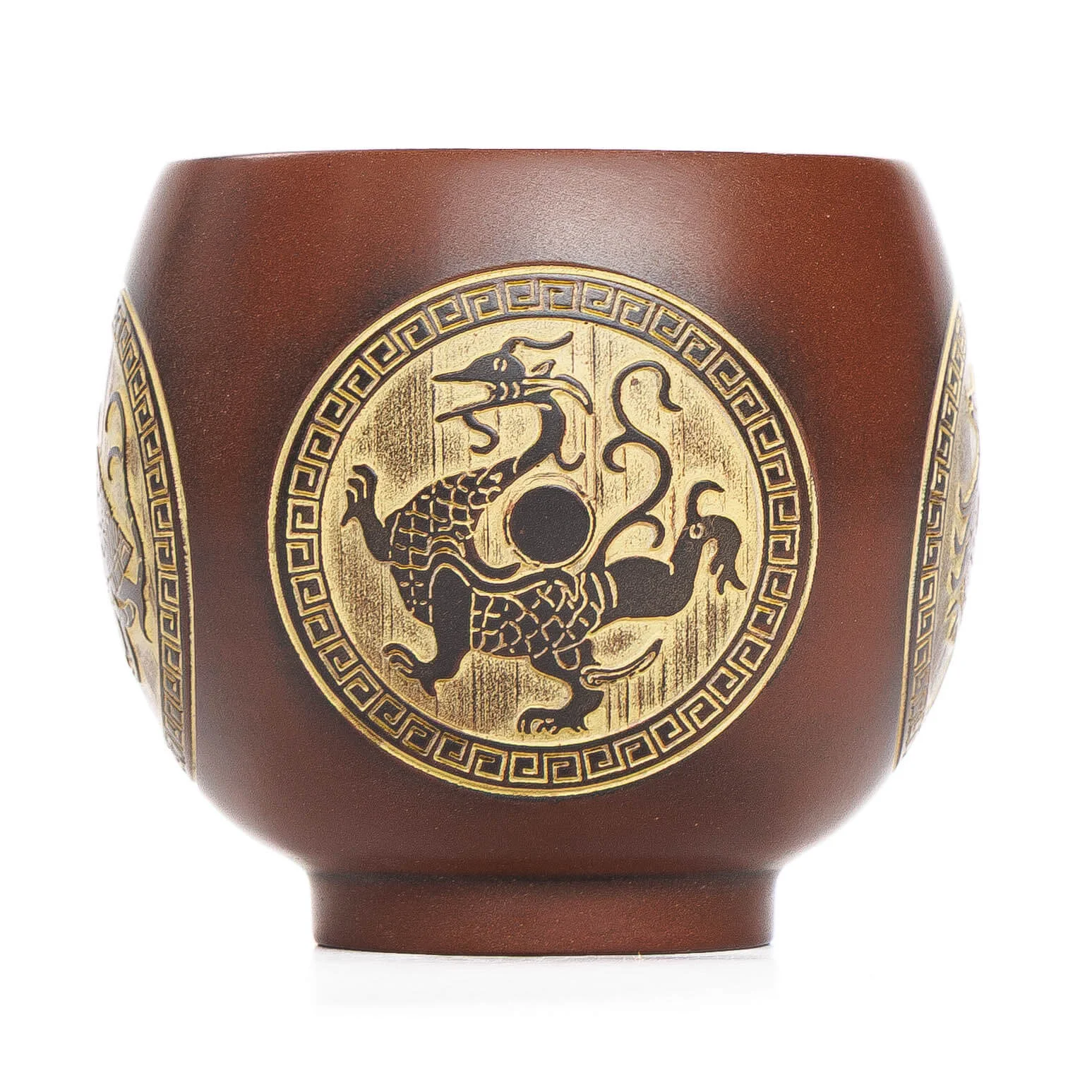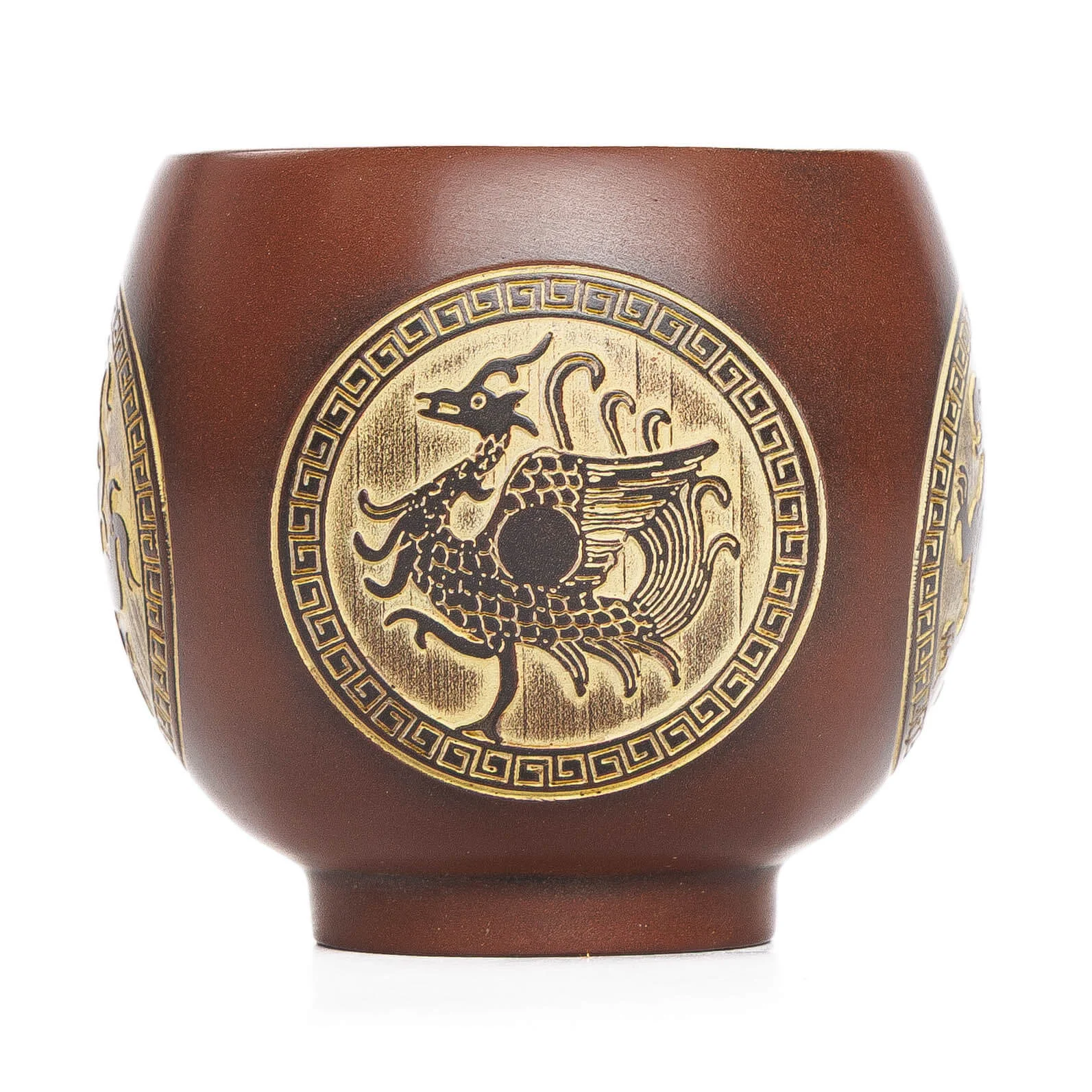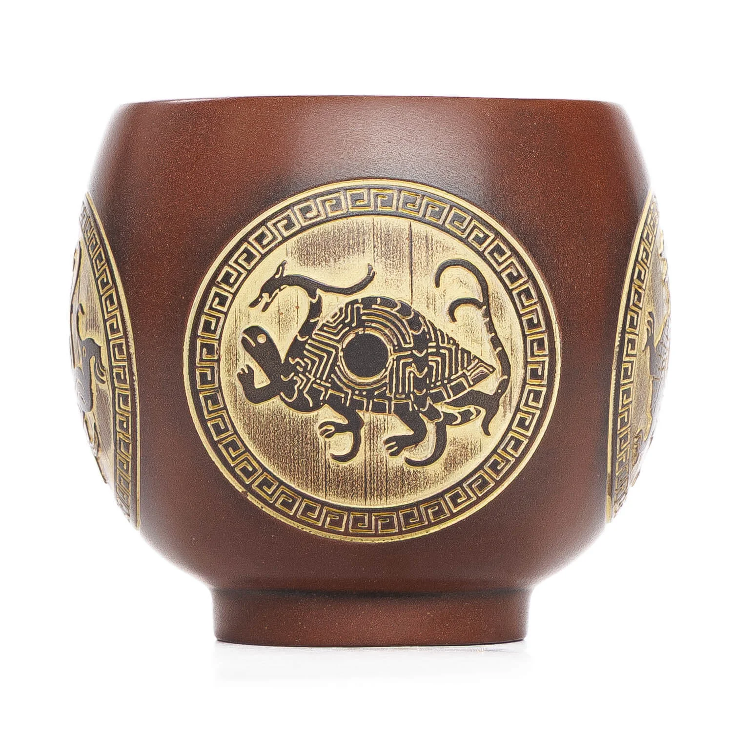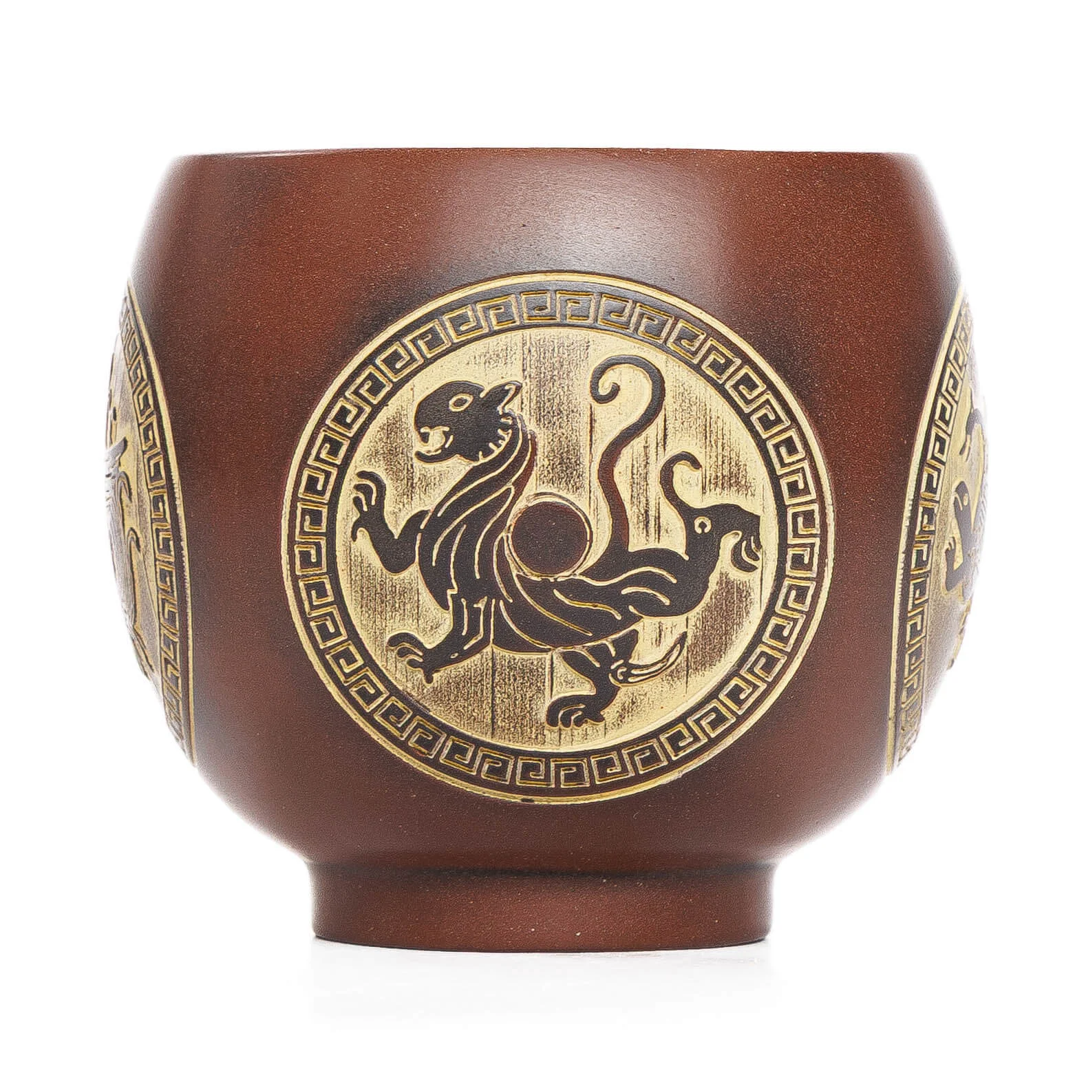 Чайна піала, виготовлена з цзяньшуйської глини, та прикрашена рельєфним золотистим медальйоном із зображенням міфічних істот та традиційним геометричним орнаментом «меандр».