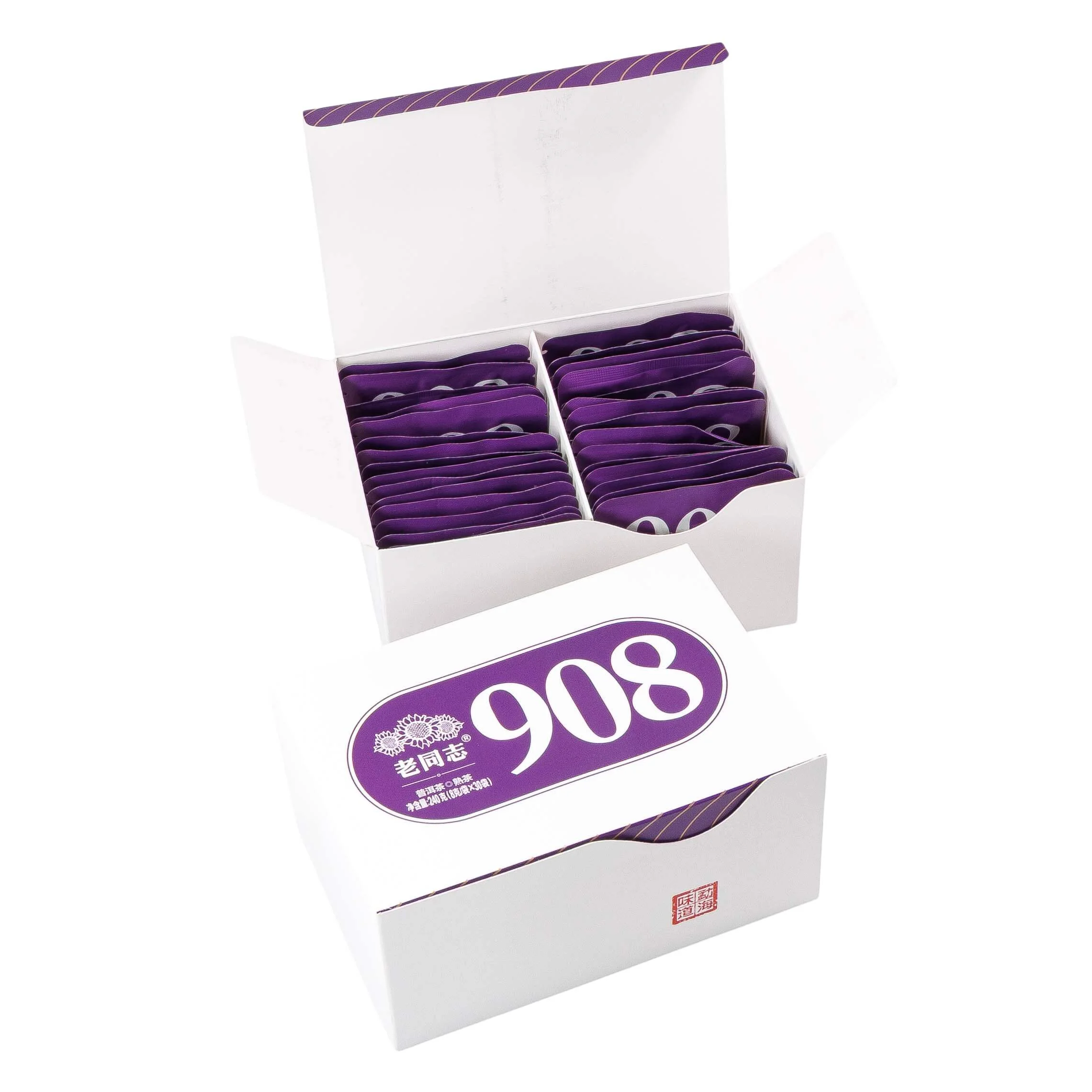 Порційний шу пуер Лао Тун Чжи «908» — класичний постферментований чай з провінції Юньнань, виготовлений на фабриці Хайвань під брендом «Старий Товариш» (老同志). Кожна шайба пресується у зручному форматі по 8 г та індивідуально запаковується — це дозволяє швидко заварити чай без додаткових зусиль. Ідеально підходить для офісу, подорожей або щоденного використання вдома.