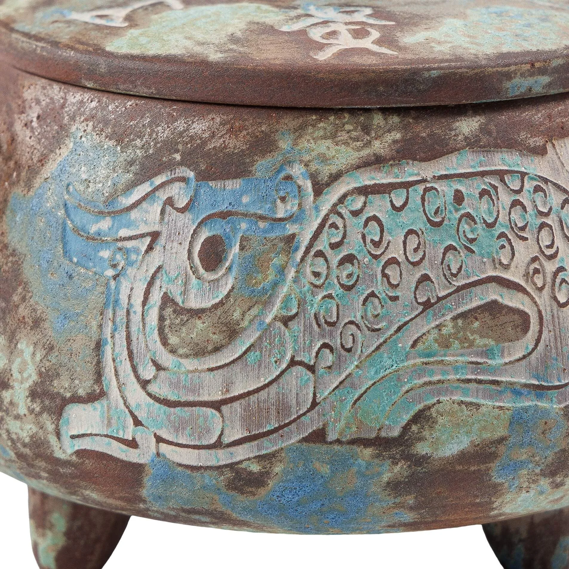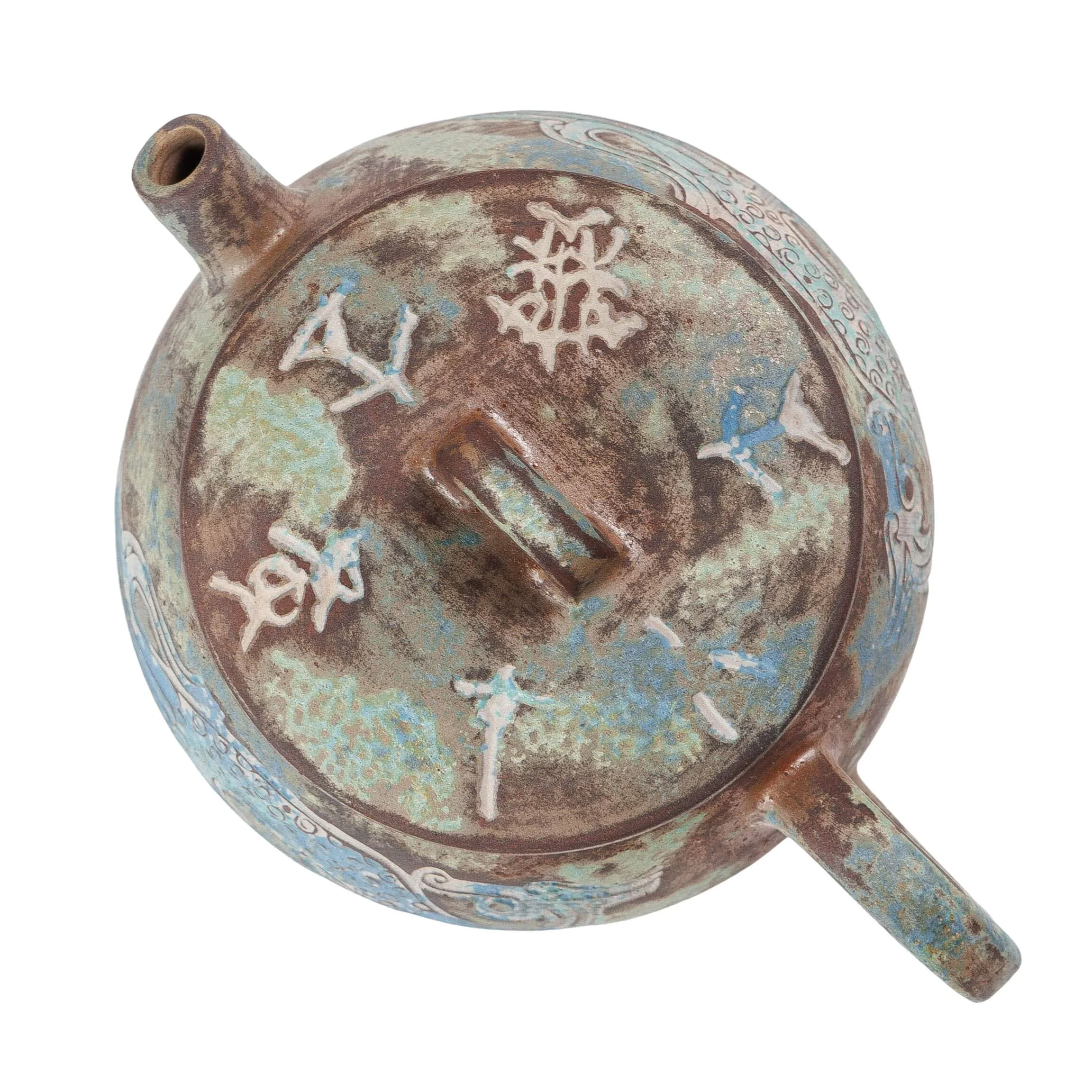 Орнамент выполнен в технике тонкой инкрустации и гравировки, характерной для цзяньшуйской керамики. Плавные завитки и изящные линии создают ощущение движения, словно дракон легко скользит сквозь облака. Минеральные переливы и мягкие оттенки подчёркивают глубину и природную красоту глины. Трёхопорная форма чайника напоминает архаичные ритуальные сосуды Древнего Китая.