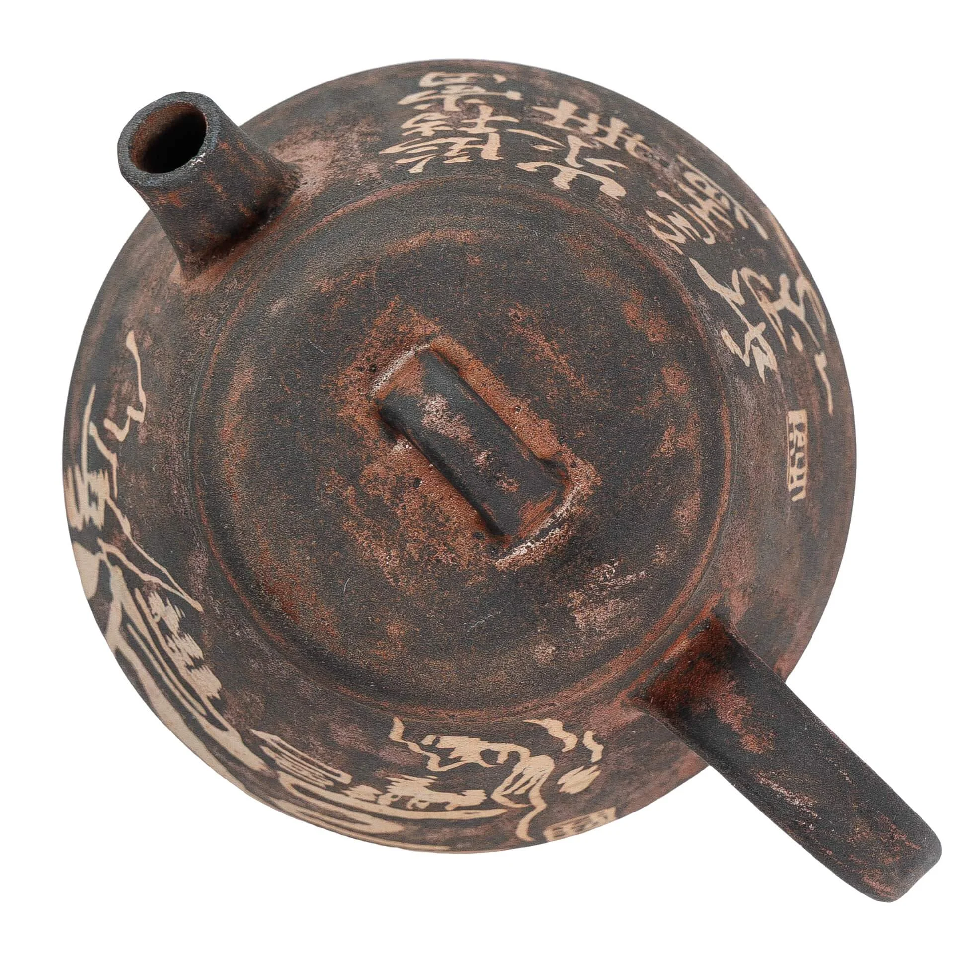 Каллиграфическая надпись и пейзаж с горами отсылают к даосской традиции уединения в природе — символу внутреннего равновесия и мудрости. Такой чайник становится не просто утилитарной вещью, а предметом искусства и источником вдохновения.