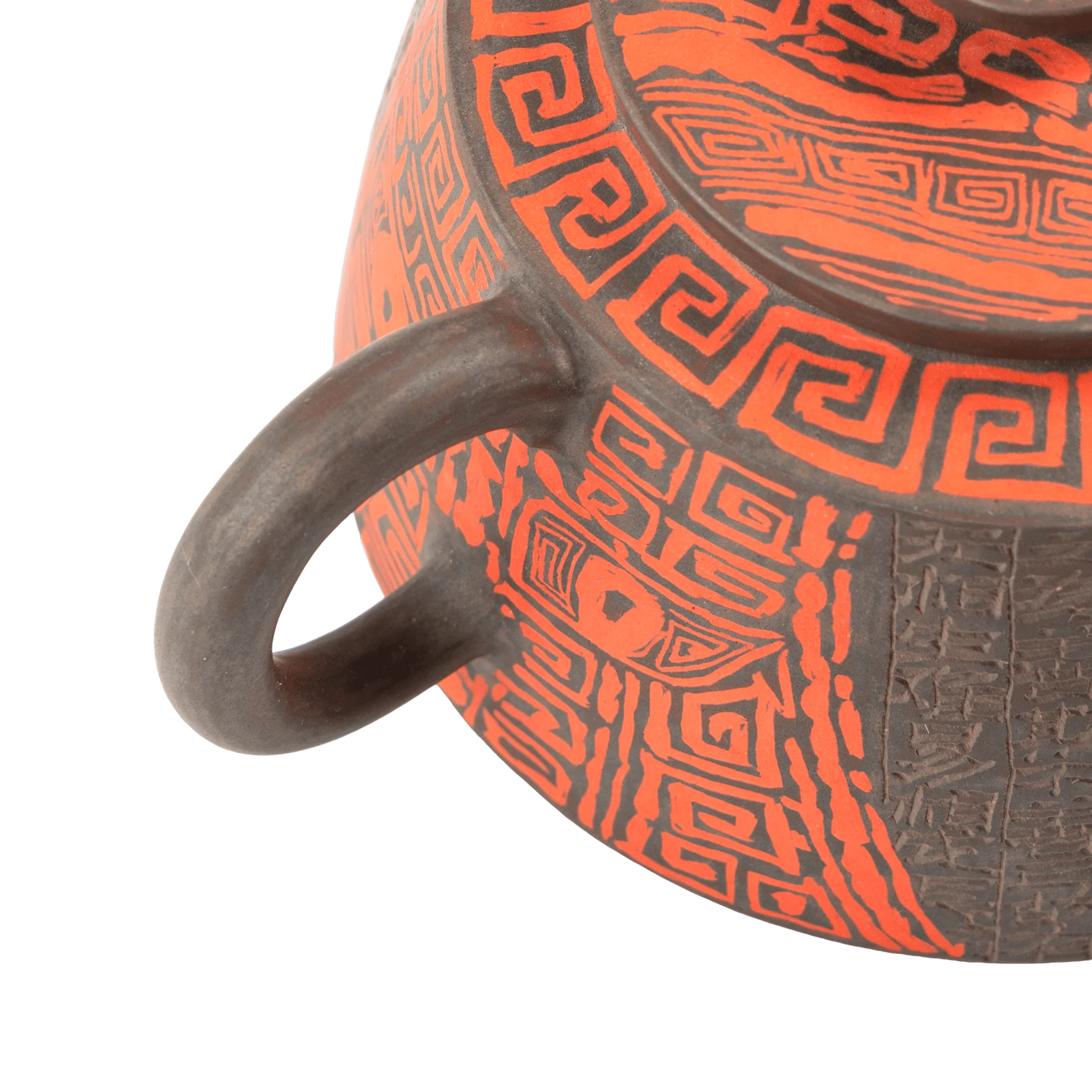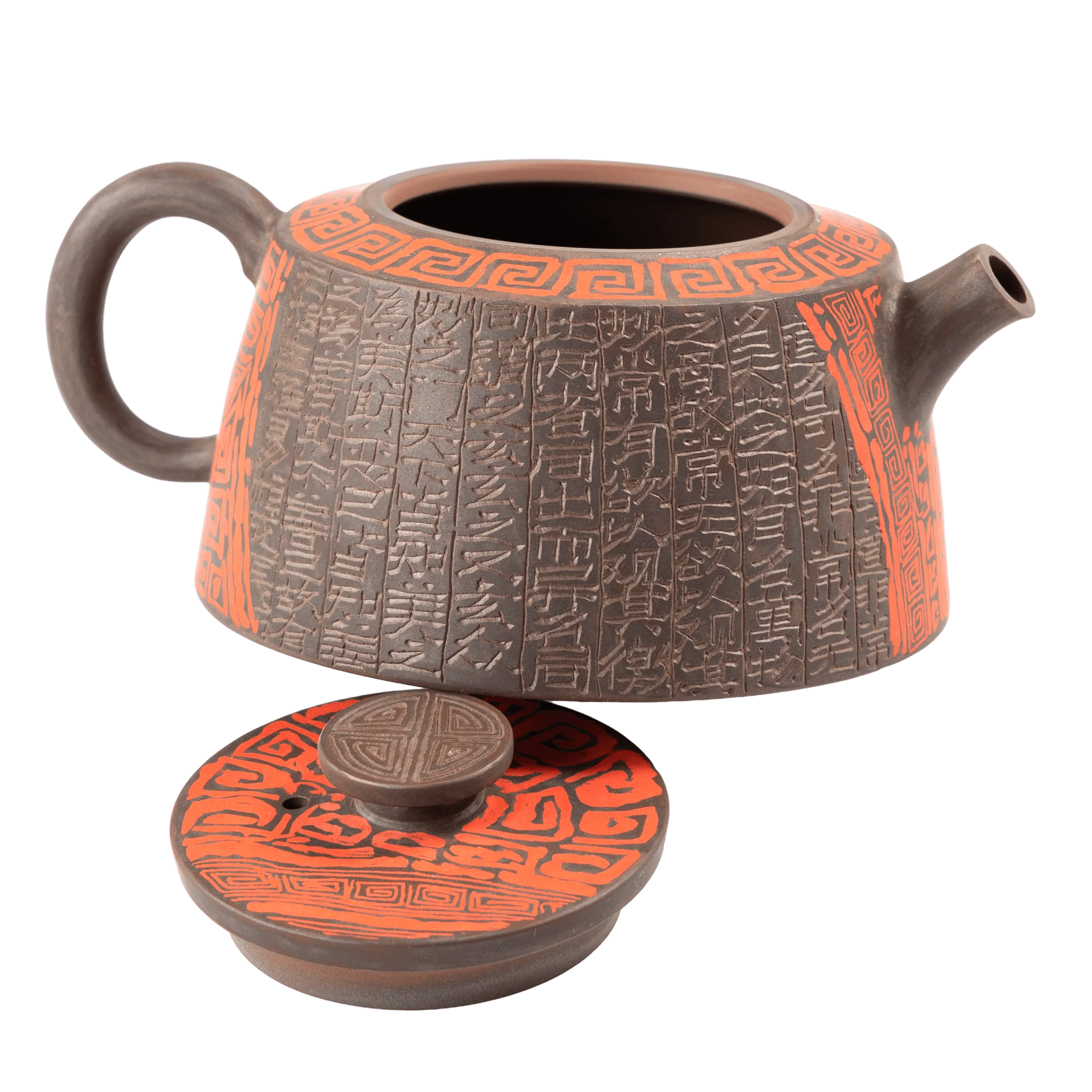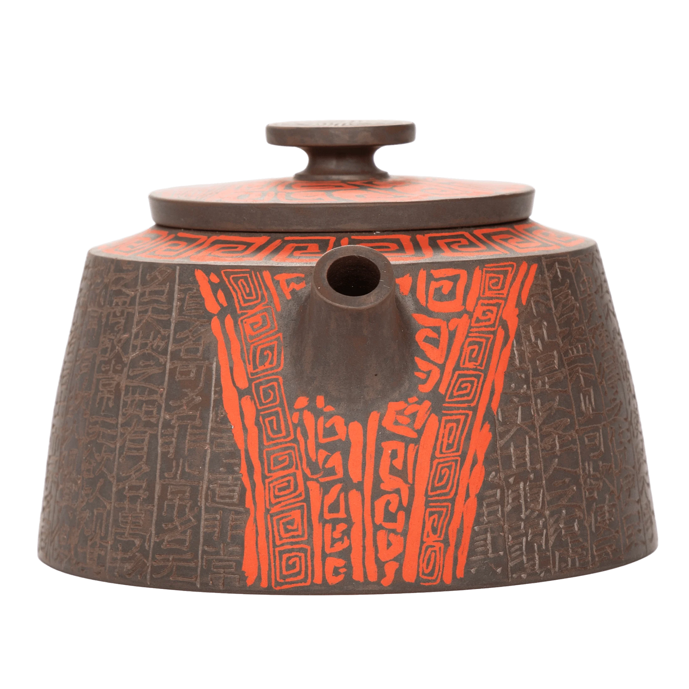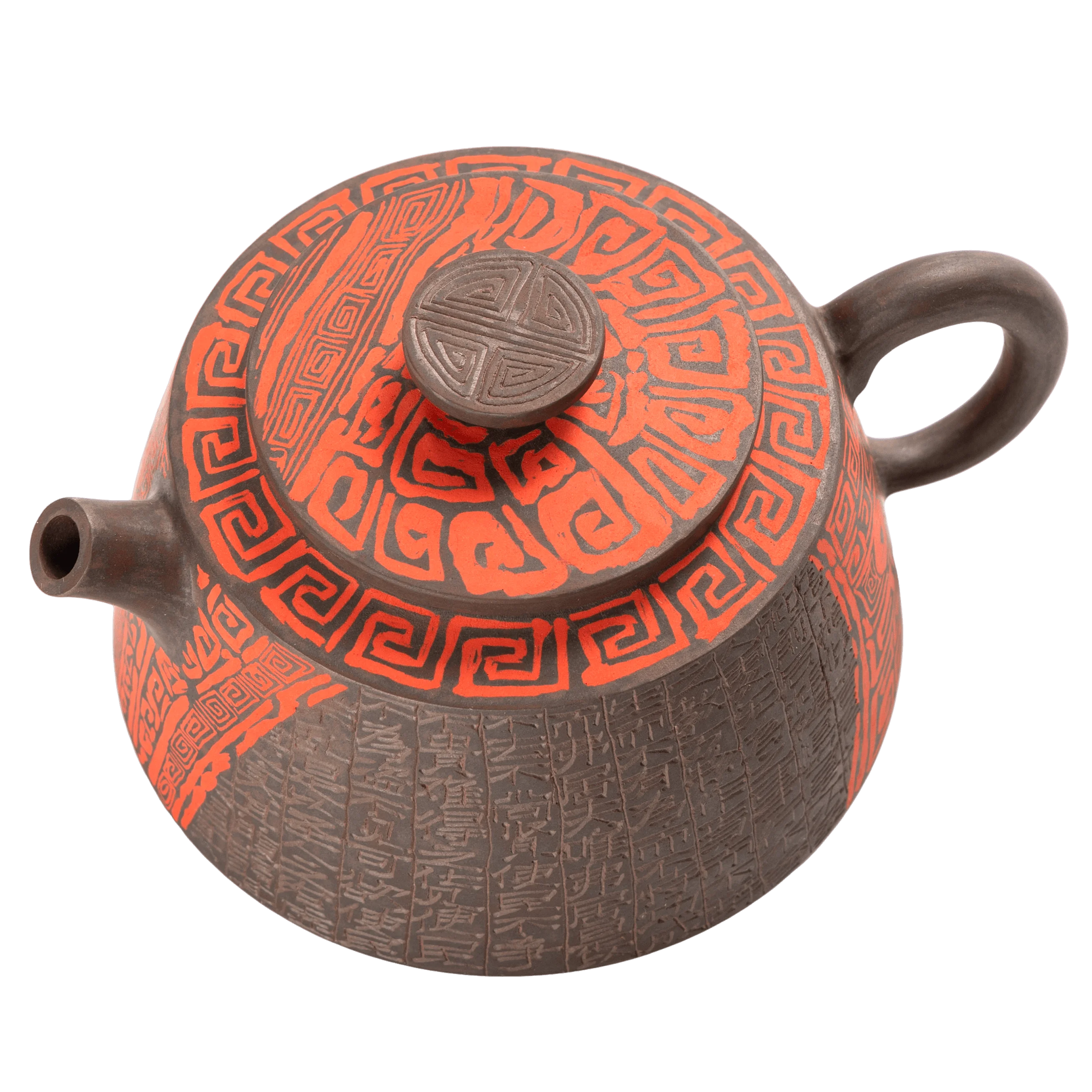 В этом чайнике важна не только сложность декора, но и общая собранность формы. Красный Таоте создаёт центр композиции, а поле иероглифов добавляет глубины, ритма и ощущения времени. Поверхность не выглядит случайной или перегруженной.