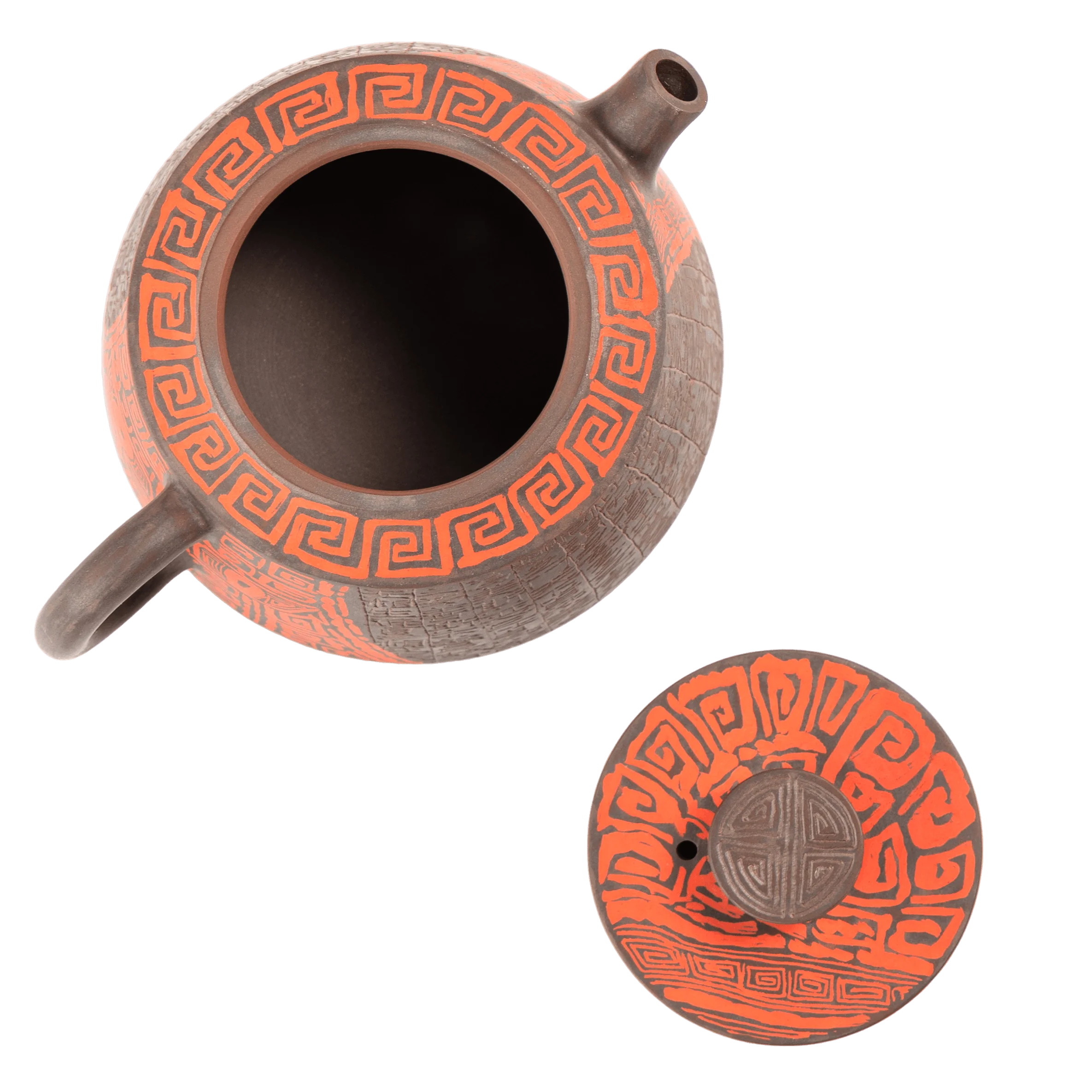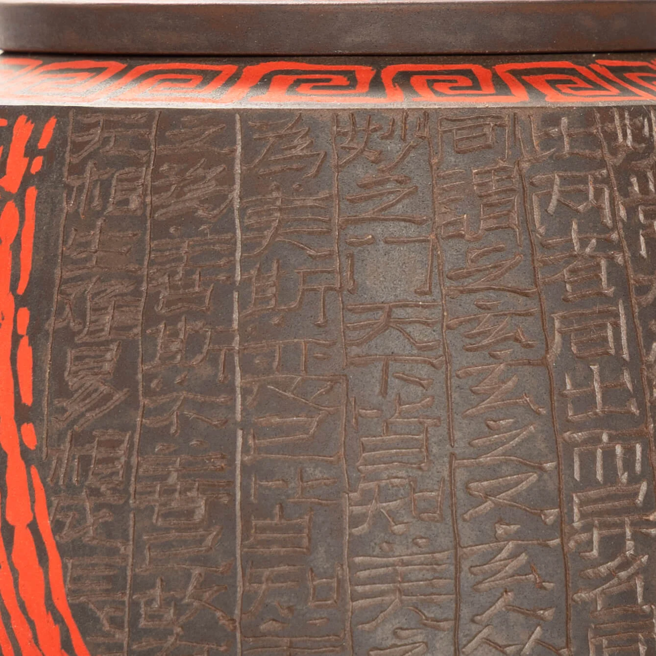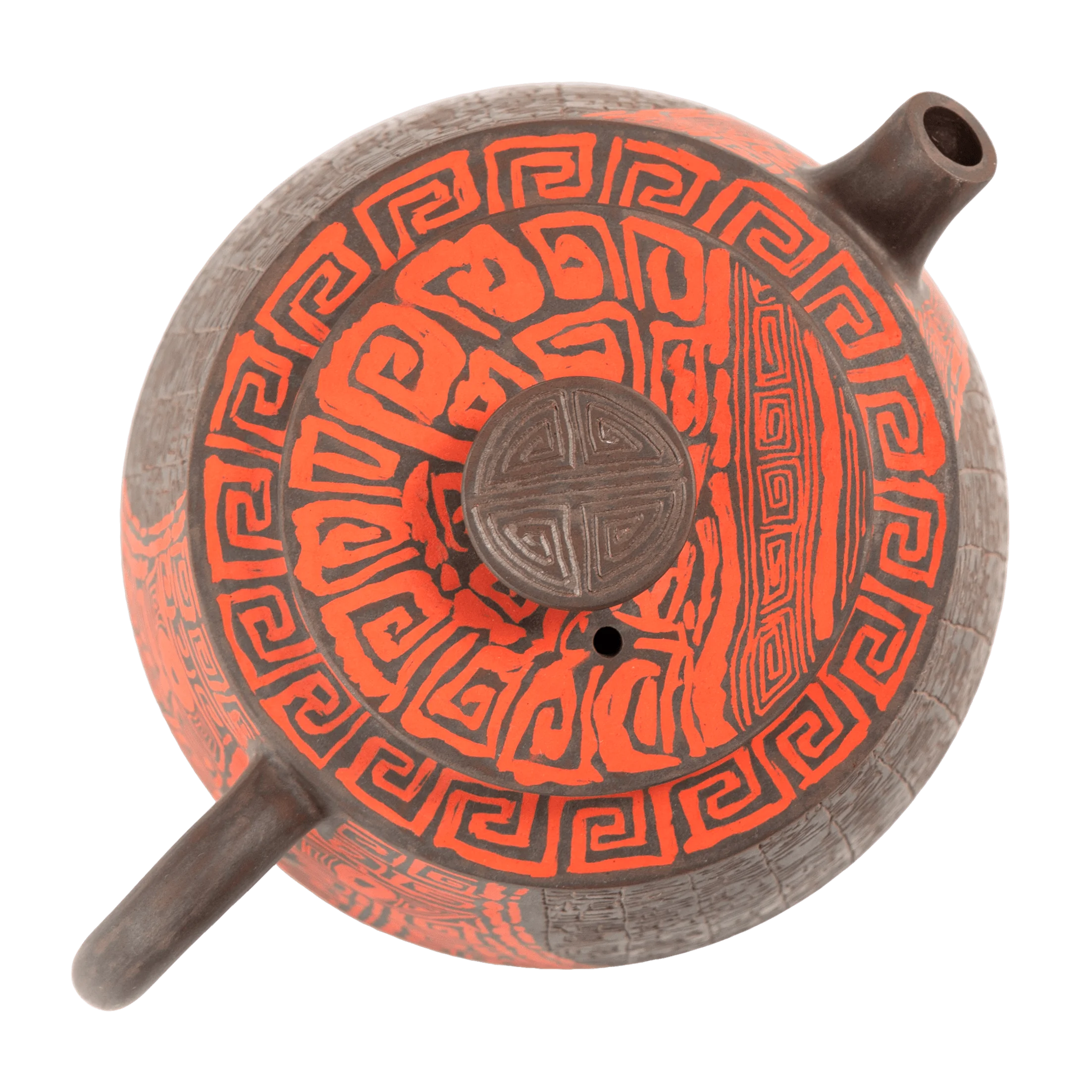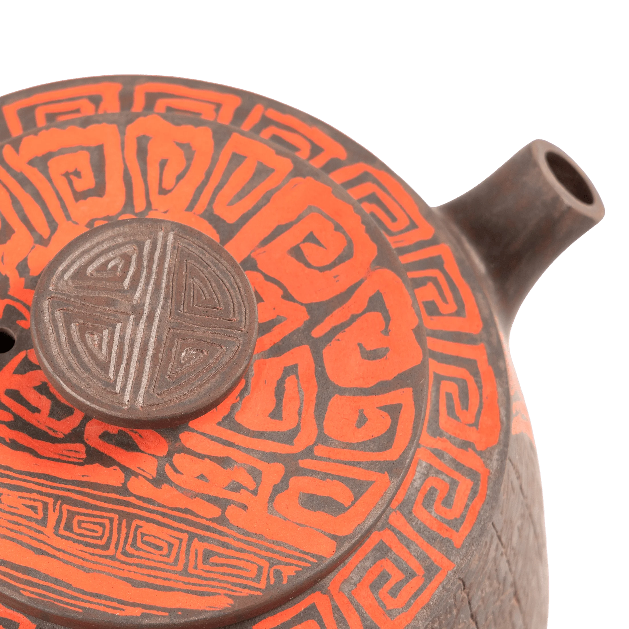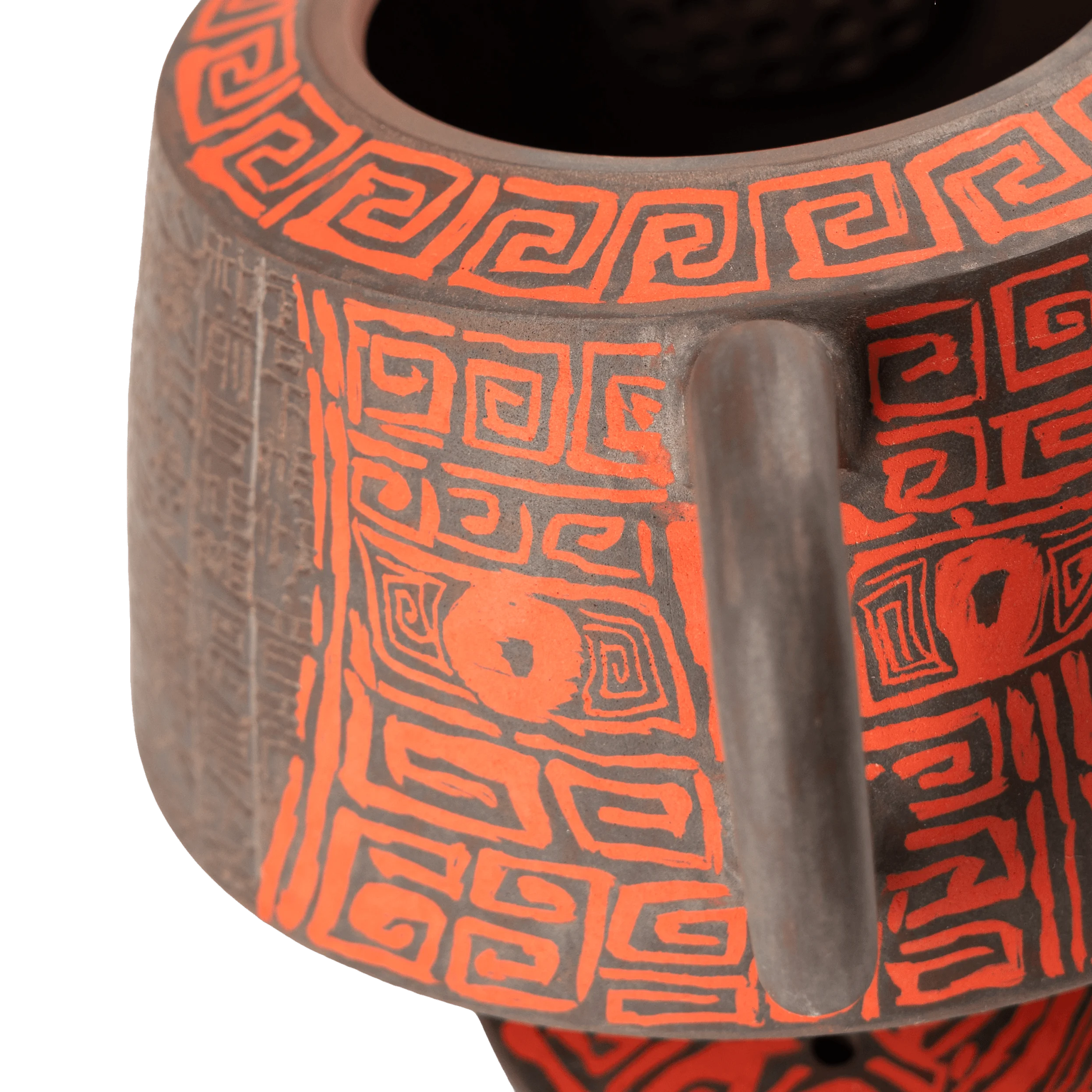 В этом чайнике важна не только сложность декора, но и общая собранность формы. Красный Таоте создаёт центр композиции, а поле иероглифов добавляет глубины, ритма и ощущения времени. Поверхность не выглядит случайной или перегруженной.
