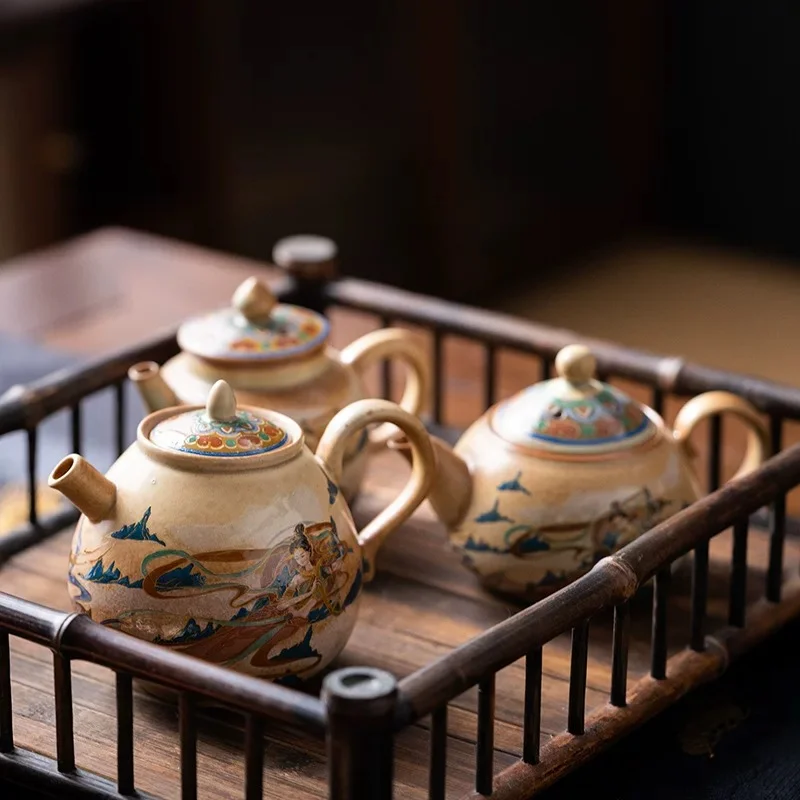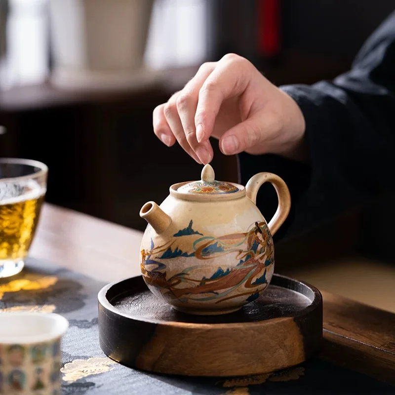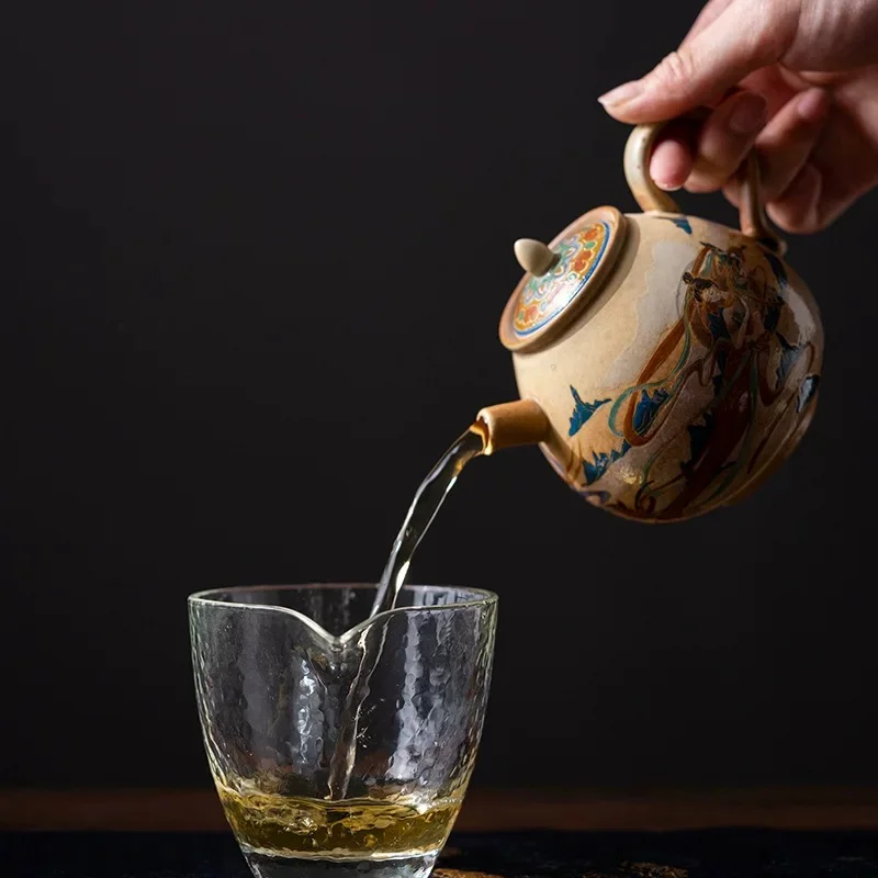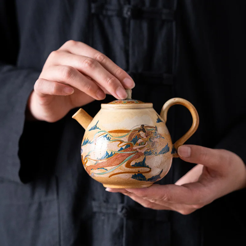 Чайник изготовлен в регионе Дэхуа, известном своей чистой, плотной глиной и традициями тонкого керамического ремесла. Изображение выполнено методом качественной шелкотрафаретной печати в стиле «Дуньхуан Фэйтянь», что обеспечивает высокую детализацию и стойкость красок.