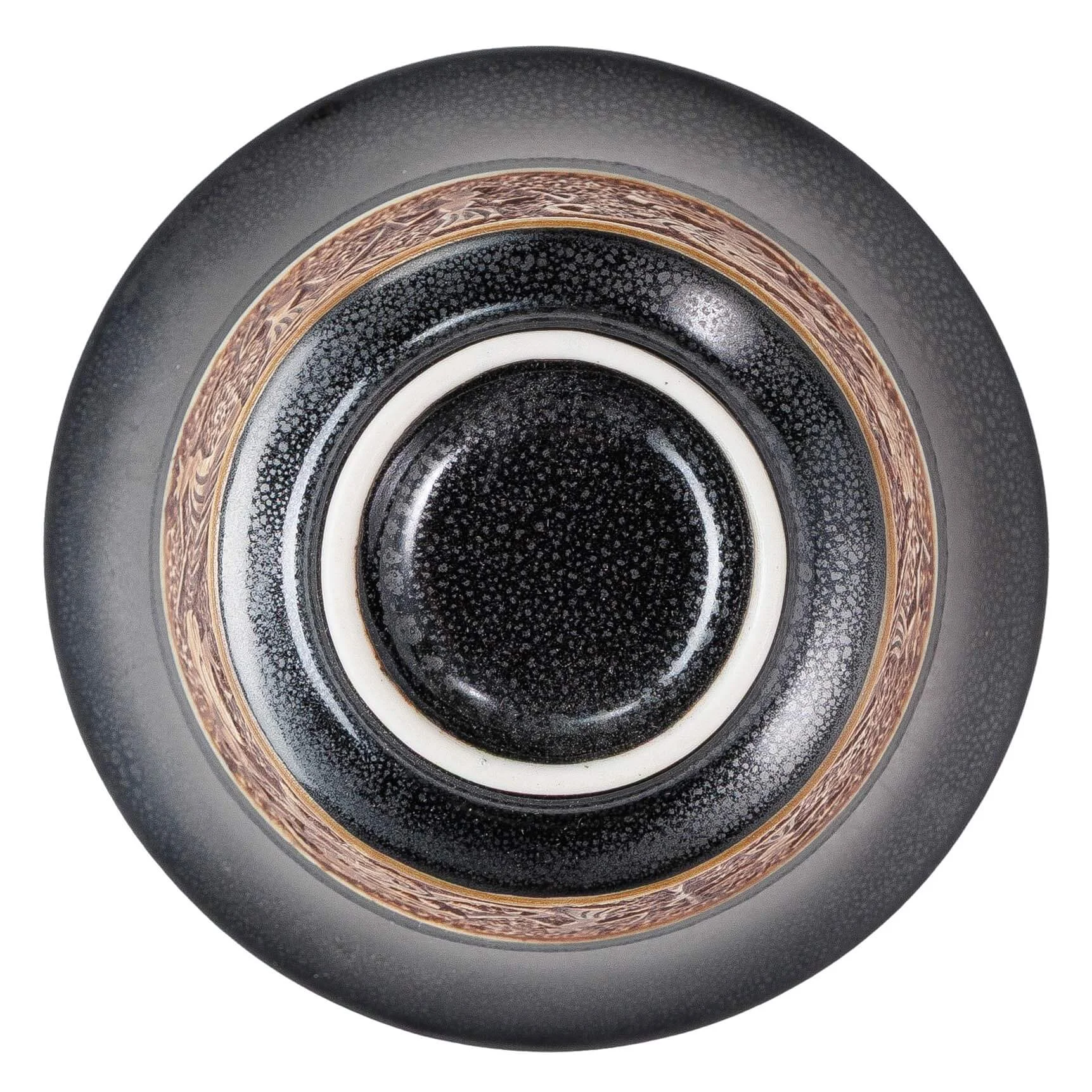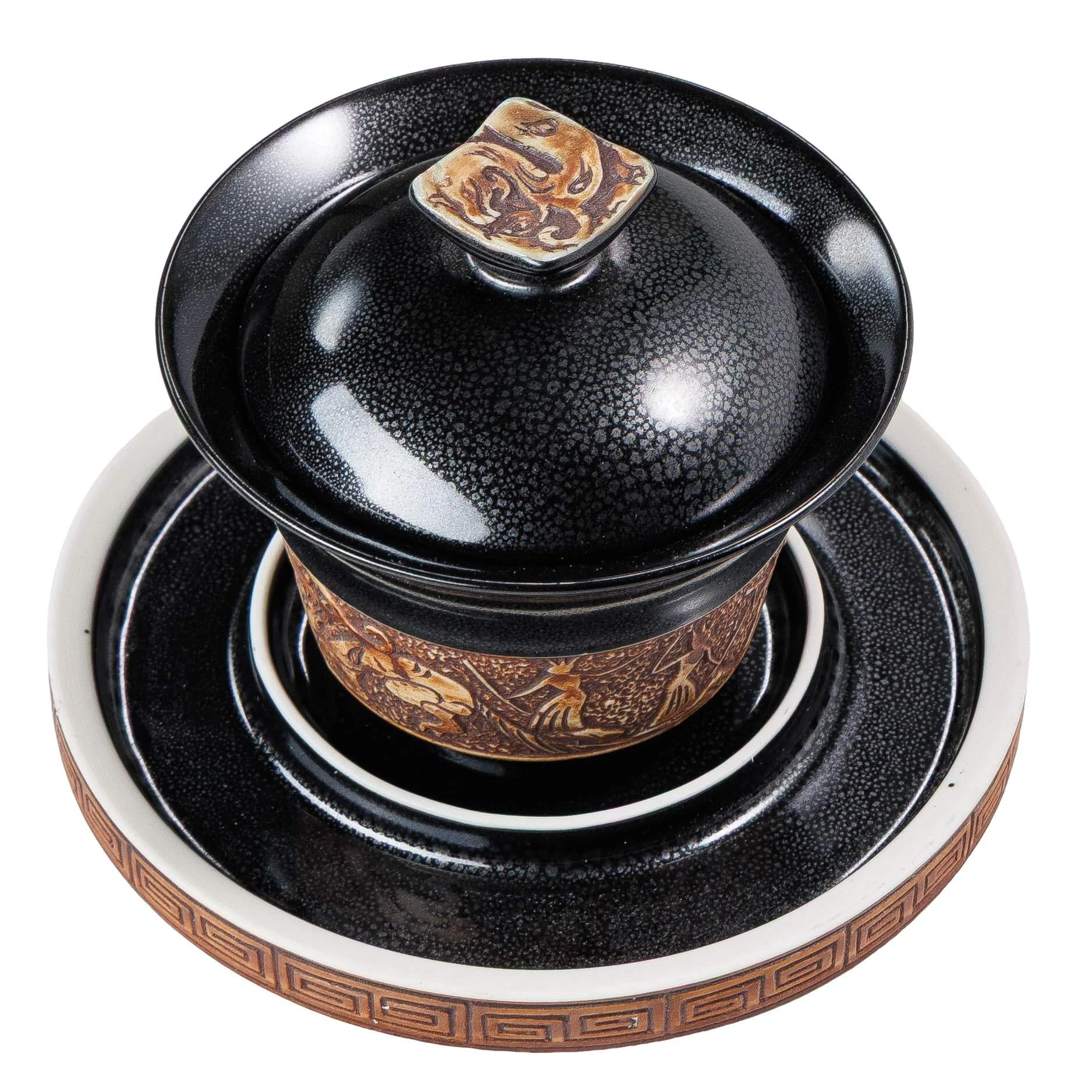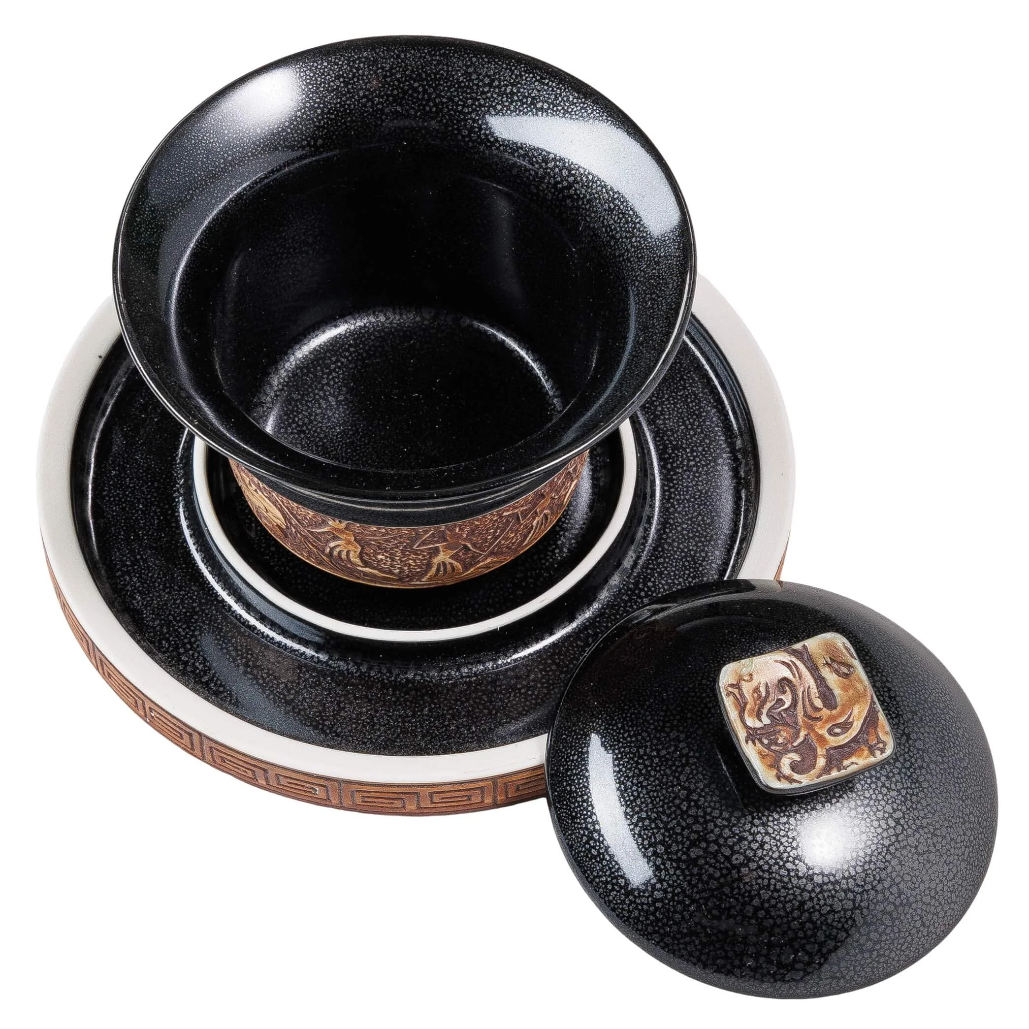 Техника огненного перелива (窑变) рождает естественную игру оттенков: от насыщенного чёрного до золотисто-медных искр. В процессе обжига глазурь проходит хаотичное преобразование, поэтому каждая гайвань уникальна. Её поверхность словно отражает звёздное небо — глубокое, спокойное и живое.