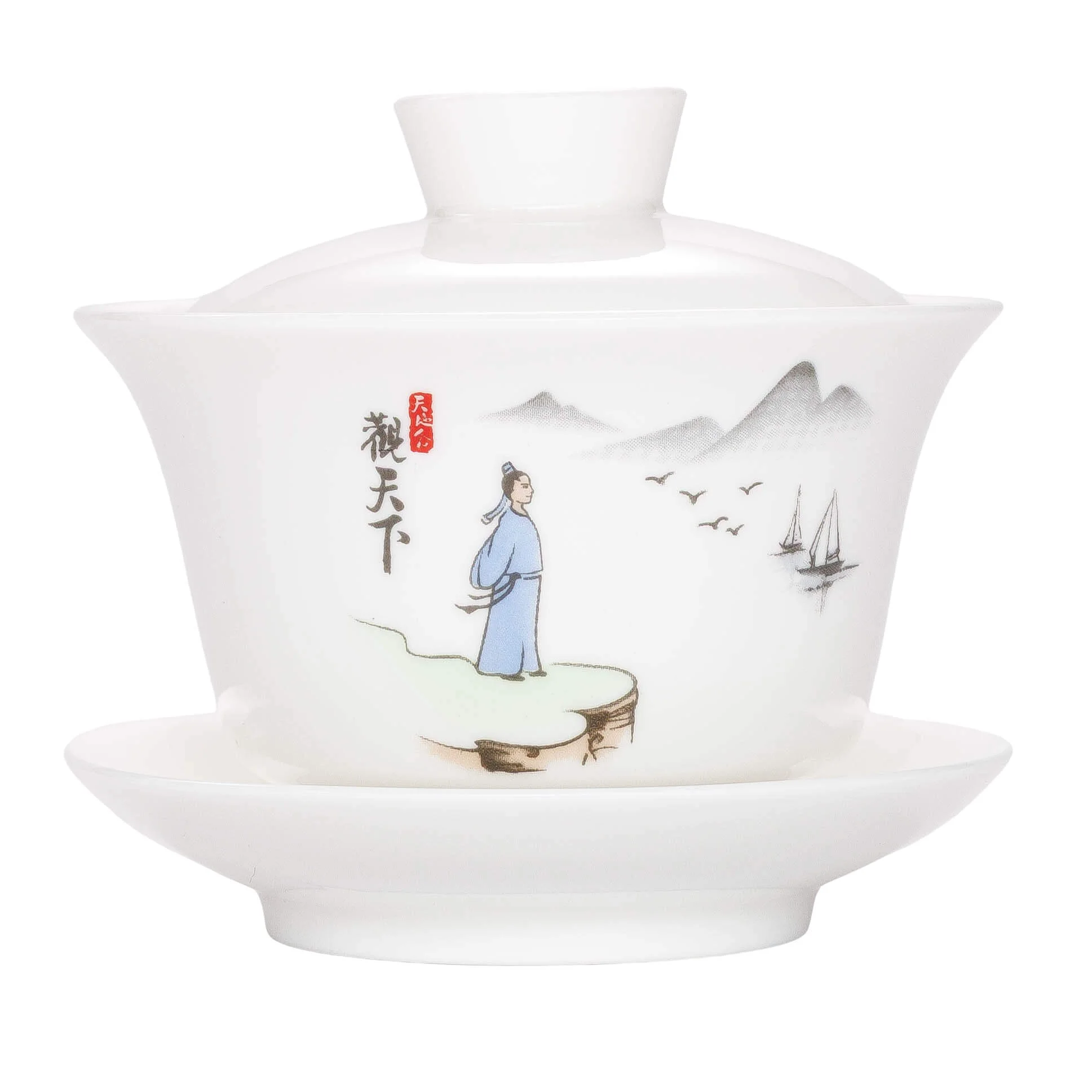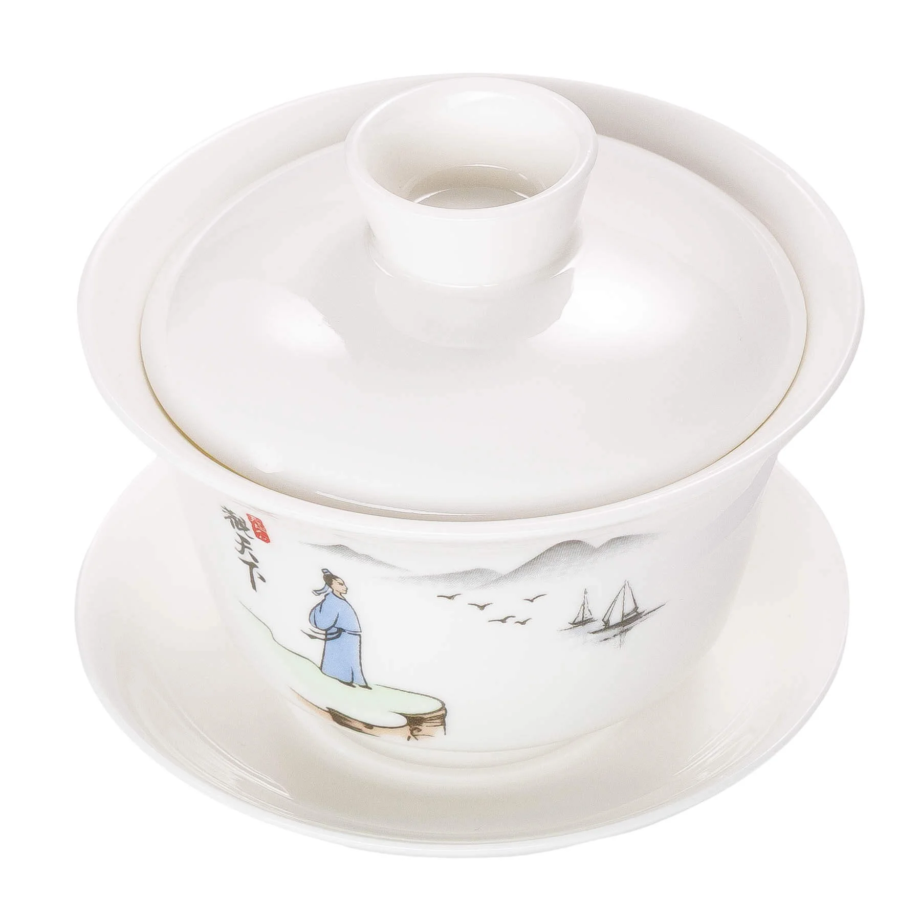 Изящная фарфоровая гайвань, рисунок выполнен в стиле традиционной китайской живописи и несет в себе глубокий символизм. Мудрец - это символ самопознания, отстраненности от мирской суеты и поиска гармонии с Дао. Горы - символизируют непоколебимость, вечность и духовное восхождение; в сочетании с туманом они намекают на тайны бытия, которые открываются только терпеливому наблюдателю. Лодки - символ жизненного пути и безопасного плавания; две лодки часто трактуют как гармонию между «я» и внешним миром.