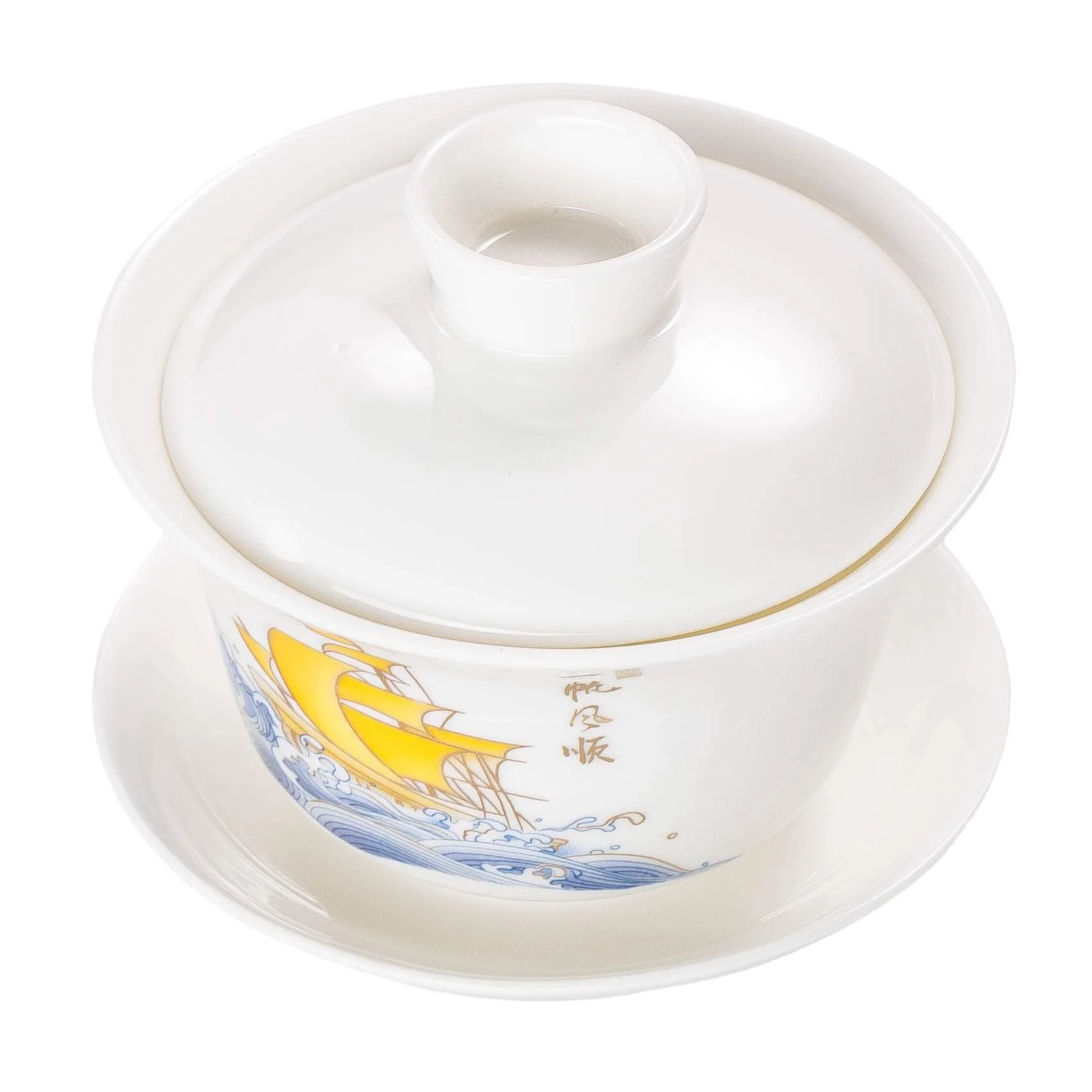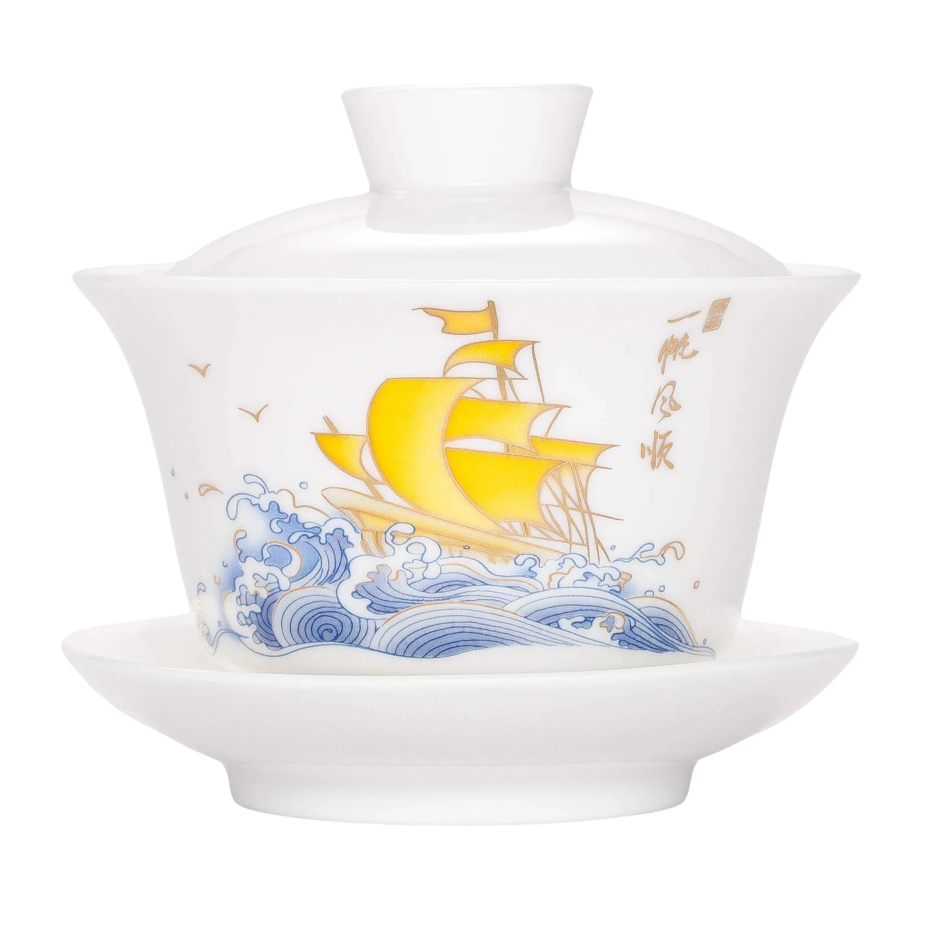 Изящная фарфоровая гайвань, рисунок выполнен в стиле традиционной китайской живописи и несет в себе глубокий символизм. Золотой корабль: символ богатства, успеха и прибыльного бизнеса, «плывущий» к своему владельцу. Высокие волны: олицетворяют силу духа, способность преодолевать трудности и внутреннюю стойкость.