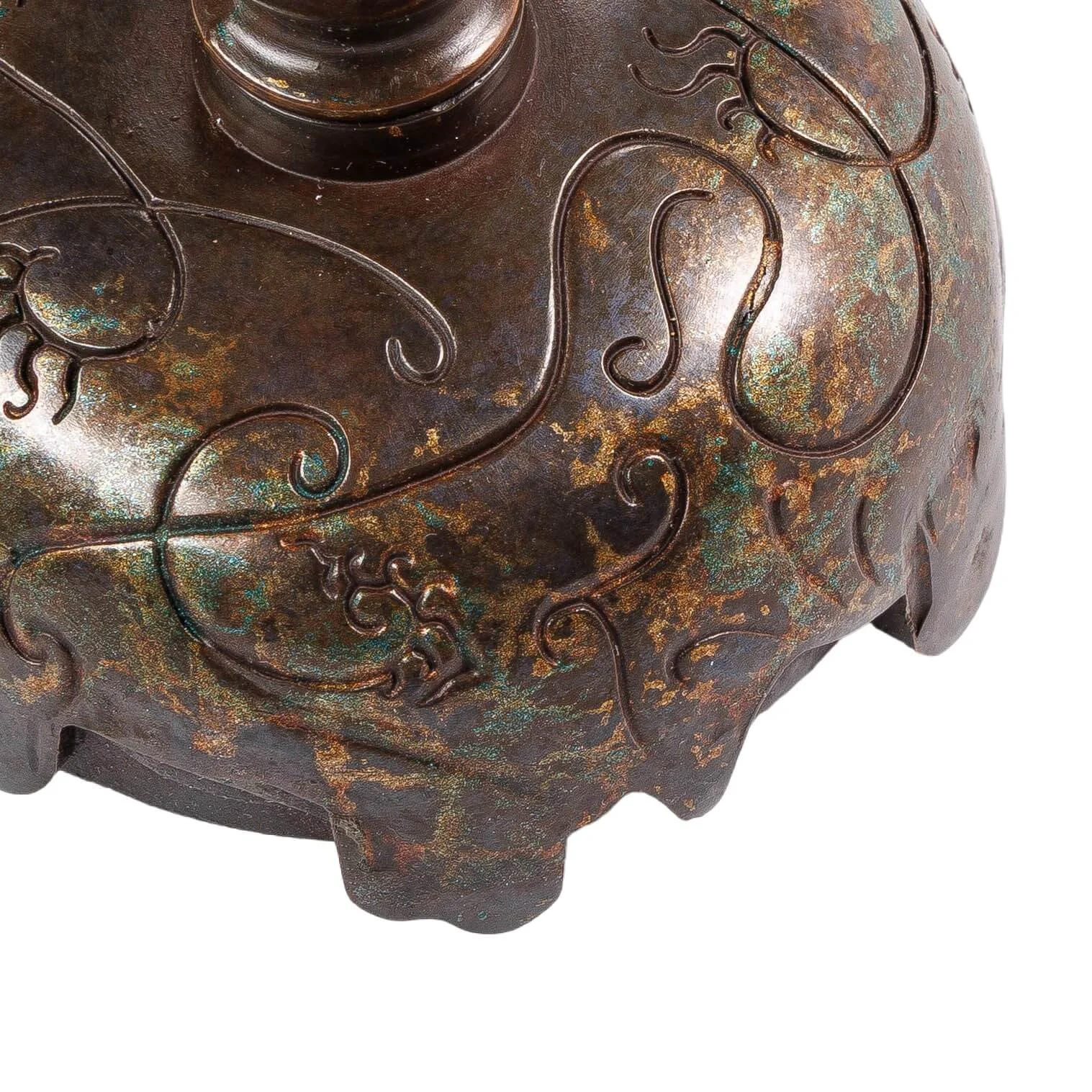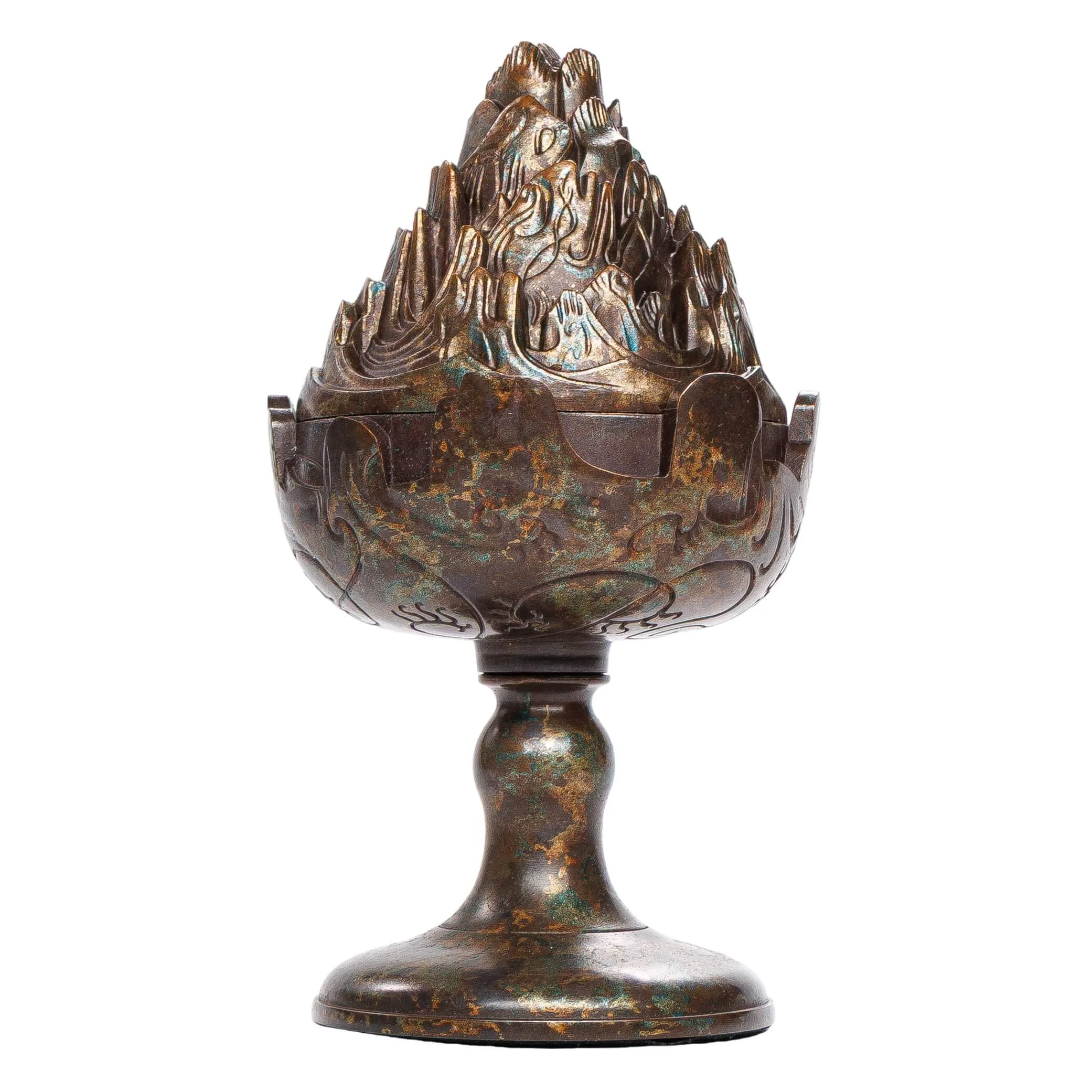 Декоративная курильница в форме Бошань (博山炉) — символической «горной вершины», вдохновлённая классической китайской традицией ароматической культуры. Объёмная крышка с рельефом гор и благородная патина в сине-золотых оттенках создают выразительный, глубокий образ с ощущением старинной эстетики.