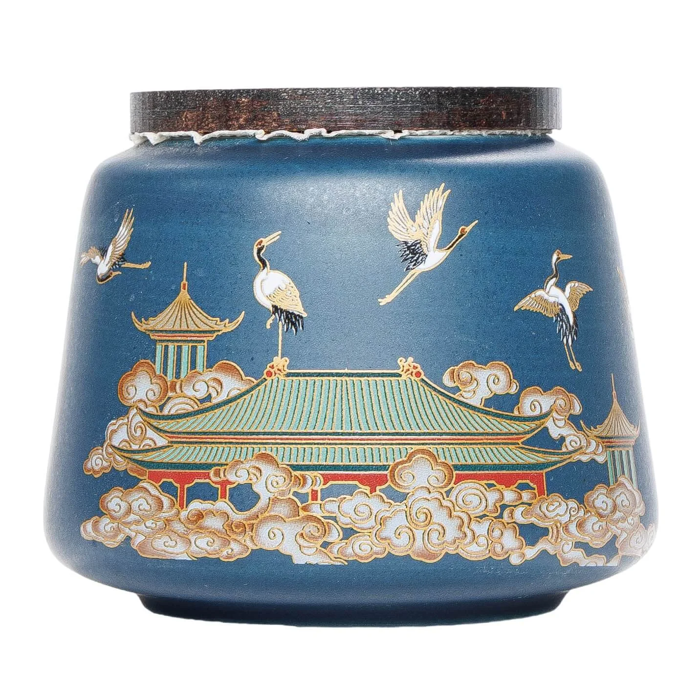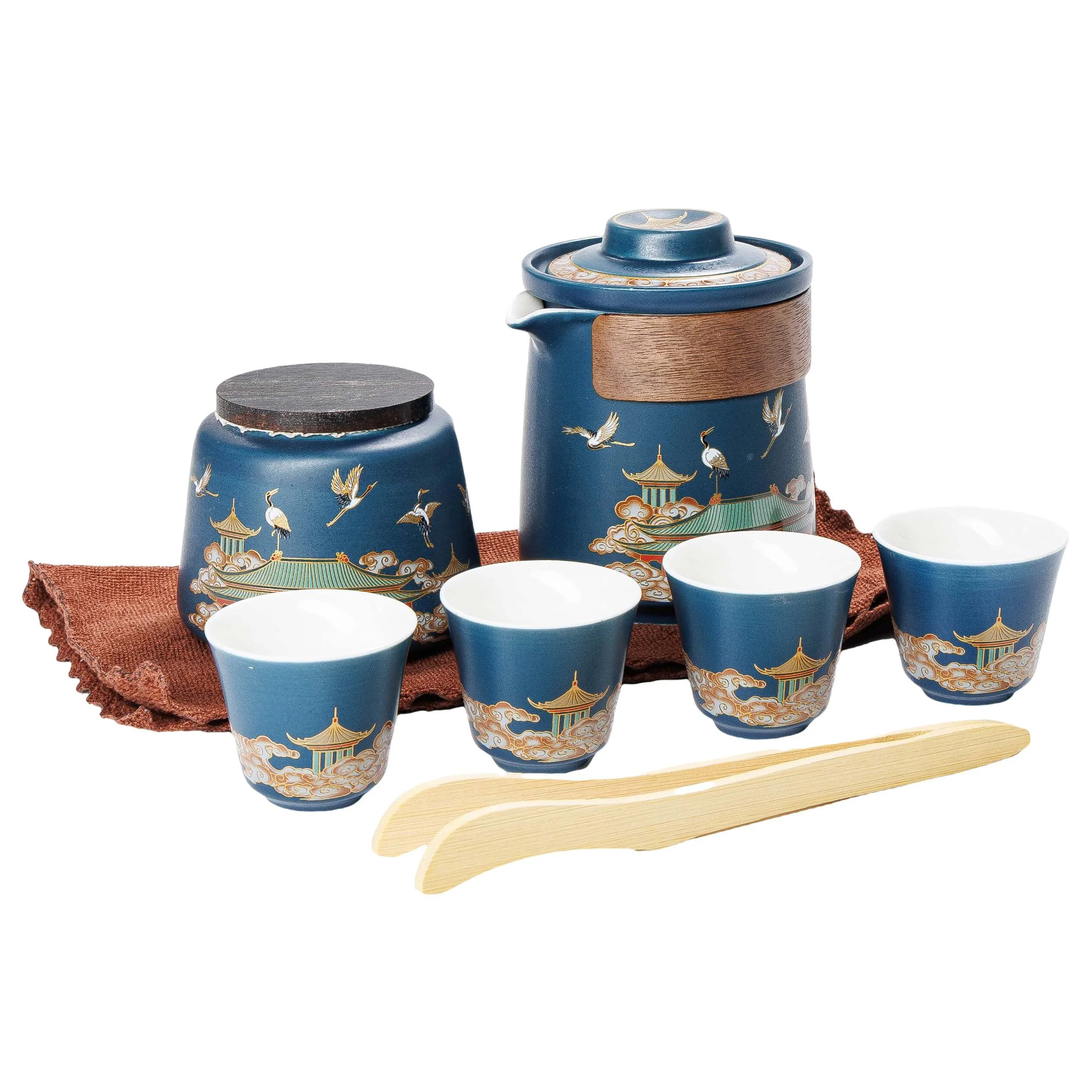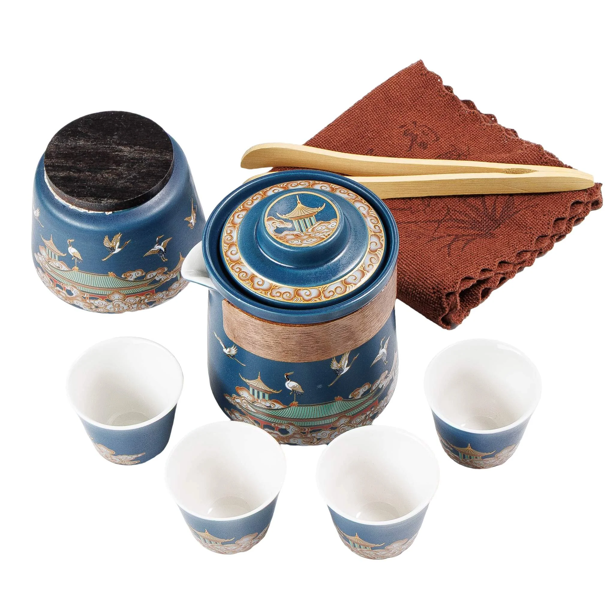 Стильный дорожный набор для чаепития, выполненный из матовой керамики с традиционным орнаментом журавлей. В комплект входят заварник с фильтром, пиалы, компактная чайница и жесткий кейс для удобной транспортировки. Подходит для путешествий, офиса и домашнего чая, сочетая практичность и эстетику восточных традиций.
