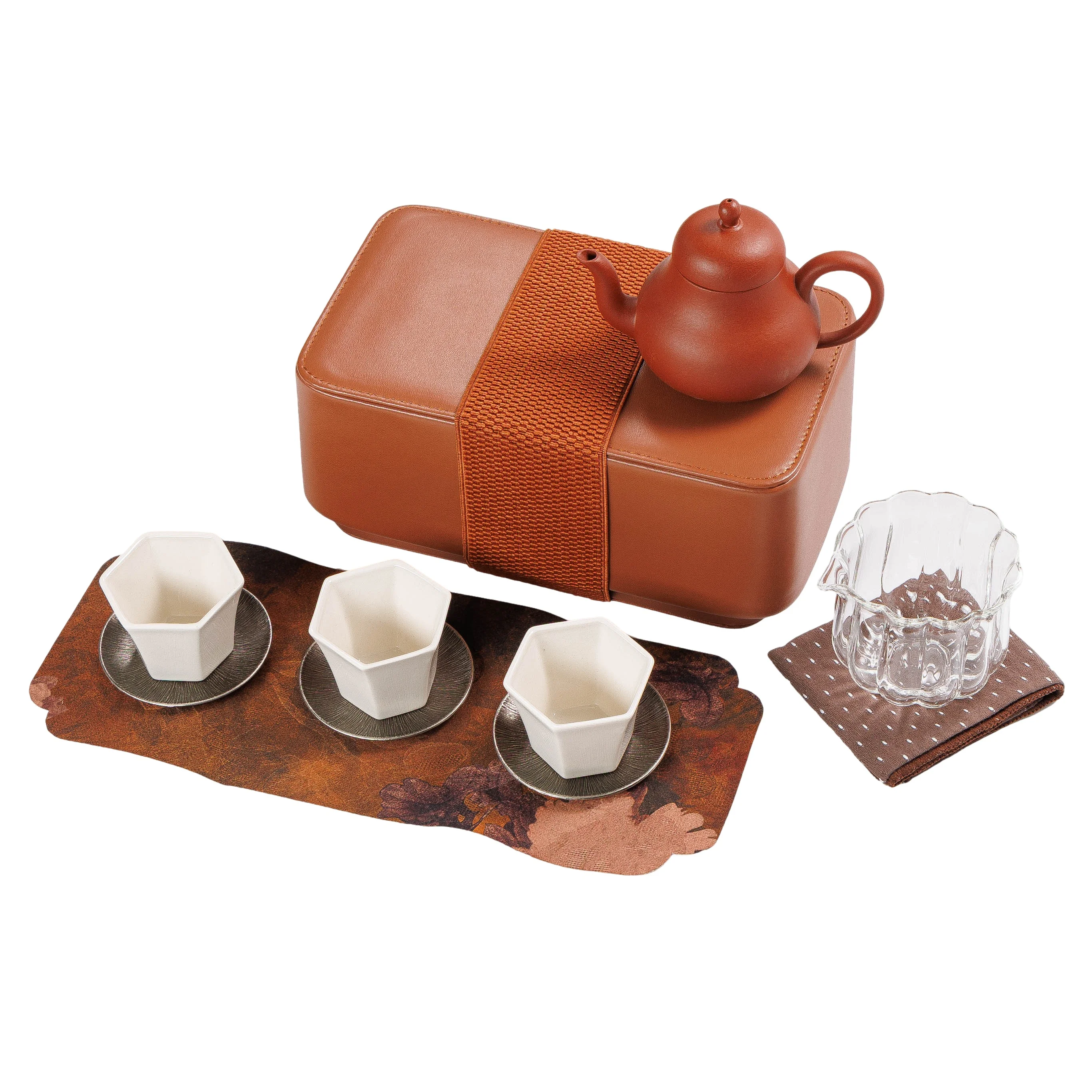 Стильный, функциональный и долговечный набор посуды для чаепития в путешествии или на природе. Посуда изготовлена из высококачественной керамики. Глиняный чайник ручной работы, изготовленный из аутентичной исинской пурпурной глины (Yixing Zisha). Она известна своей пористостью, что позволяет «воспитывать» чайник, поскольку глина постепенно впитывает аромат чая. Керамические чашки белого цвета имеют современную геометрическую (граненую) форму, что обеспечивает удобное удержание, металлические подставки округлой формы. Чахай с волнистыми краями, напоминающими лепестки цветка. И компактный жесткий футляр, отделанный качественным кожзаменителем, защищающий посуду при переноске.