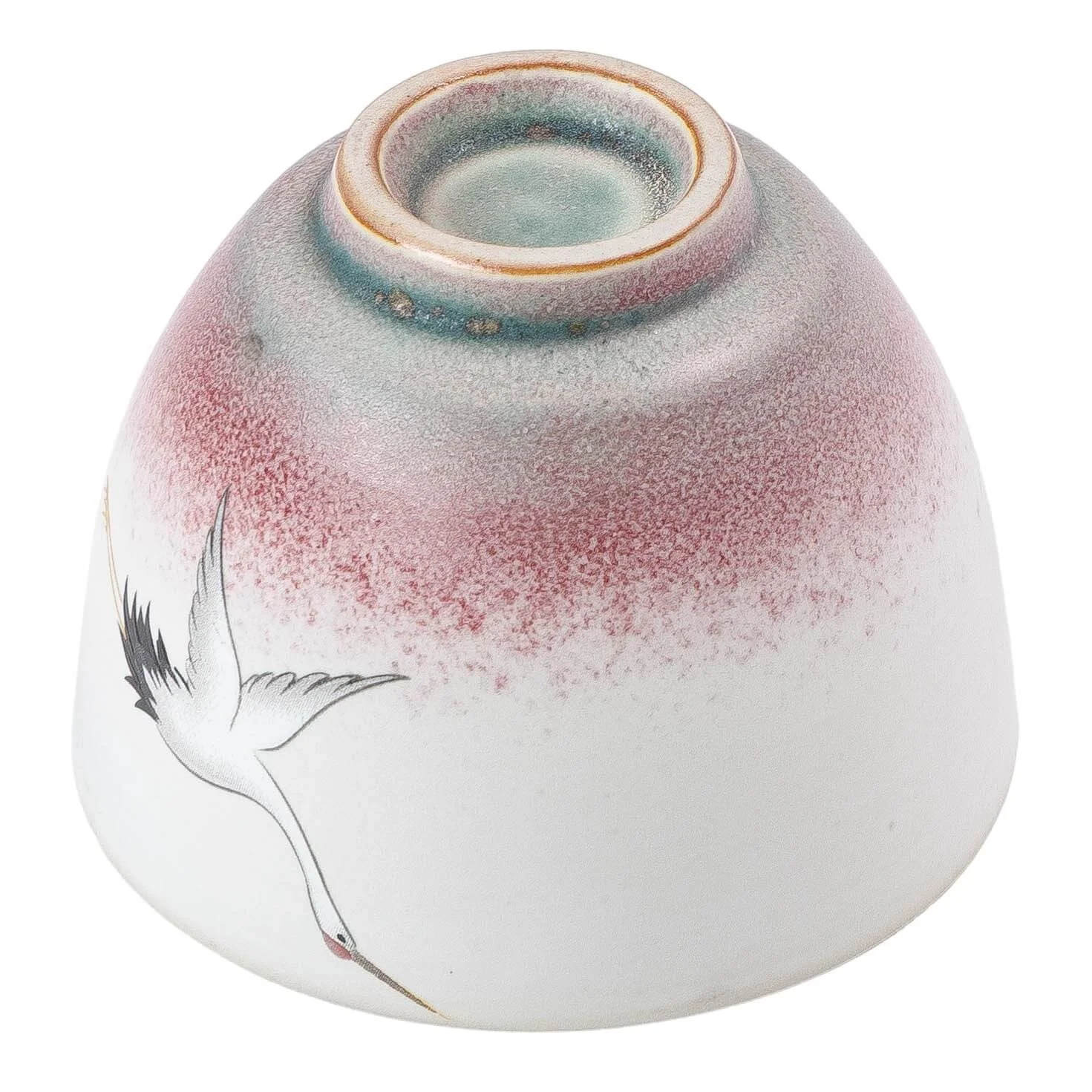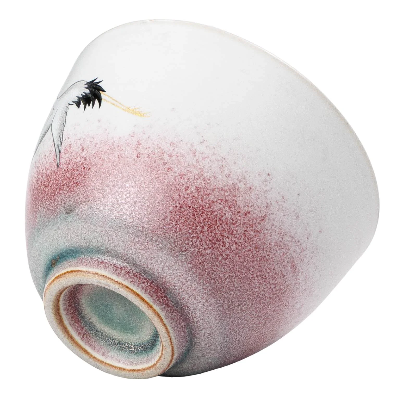 Изящная керамическая пиала 100 мл, созданная мастерами города Дэхуа (Китай). Грациозный журавль на боковой поверхности и мягкий градиент глазури передают настроение тихого рассвета — символ гармонии, долголетия и нового начала.