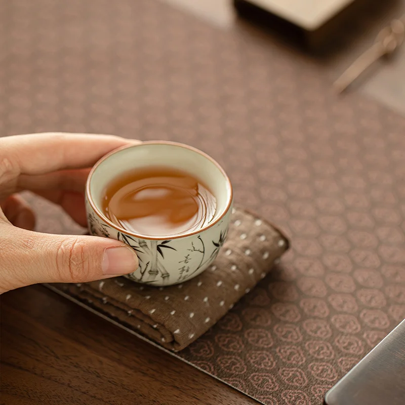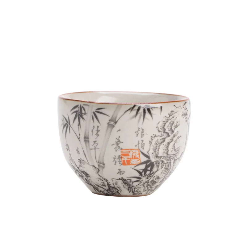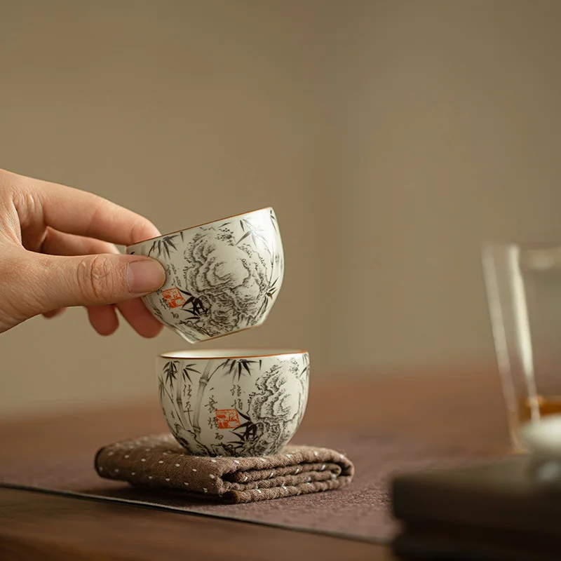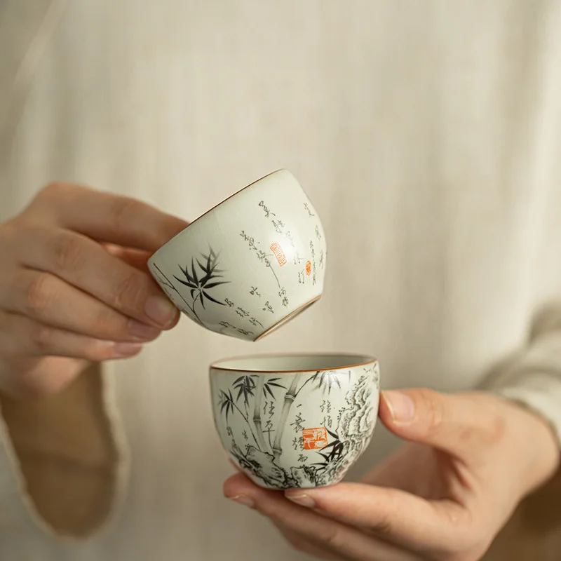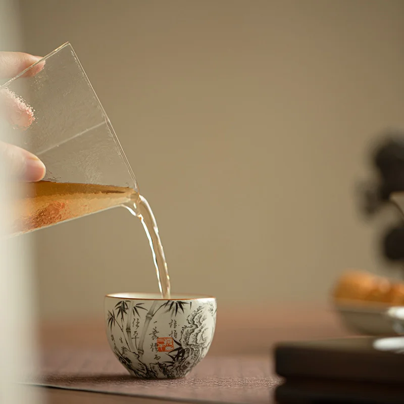 На внешней поверхности пиалы нанесена художественная роспись в традиционном китайском стиле тушью. Композиция включает изящные стебли бамбука, каллиграфические надписи и акцентную красную печать. В китайской культуре бамбук символизирует честность, внутреннюю силу, сдержанность и благородство характера.