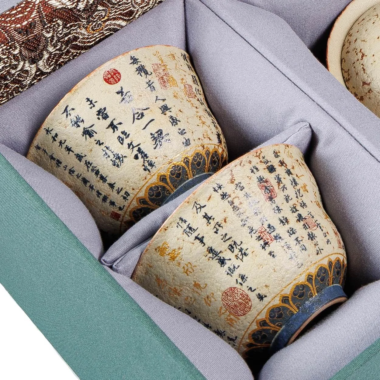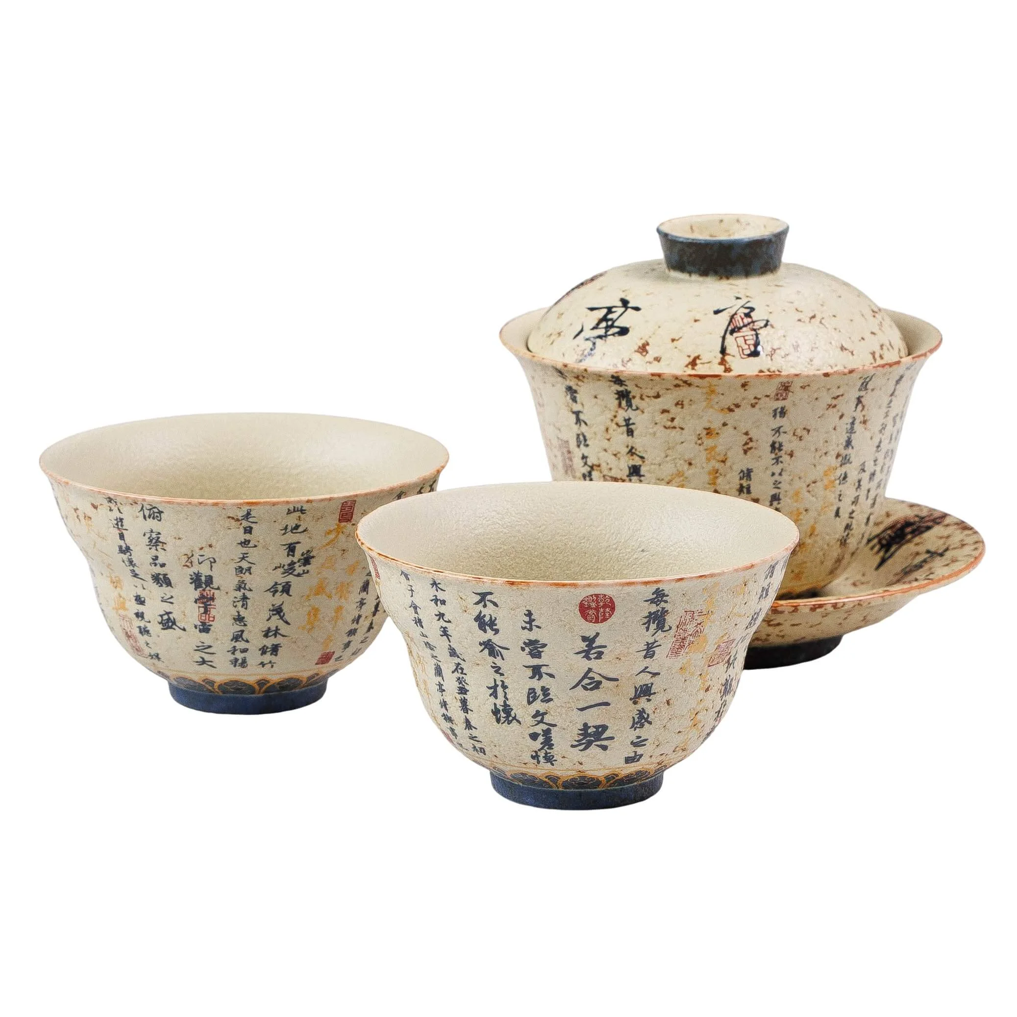Традиционный китайский чайный набор для заваривания листового чая. В комплект входят гайвань с блюдцем и крышкой, а также пиалы для подачи. Набор предназначен для спокойного и удобного чаепития.
